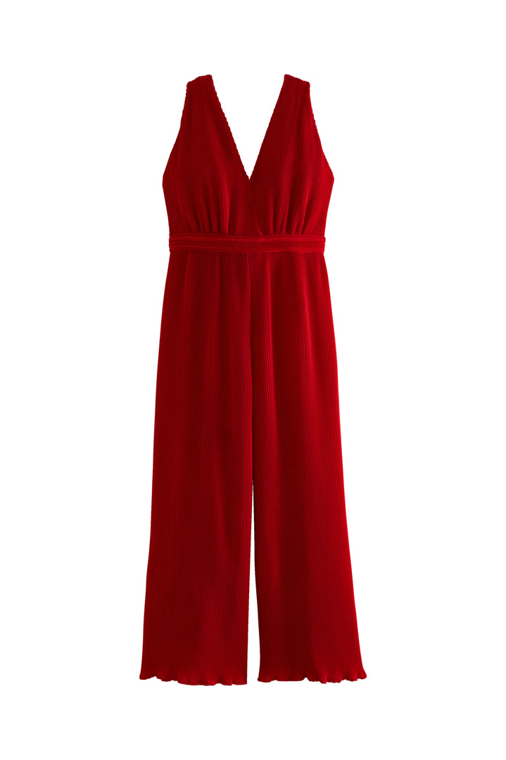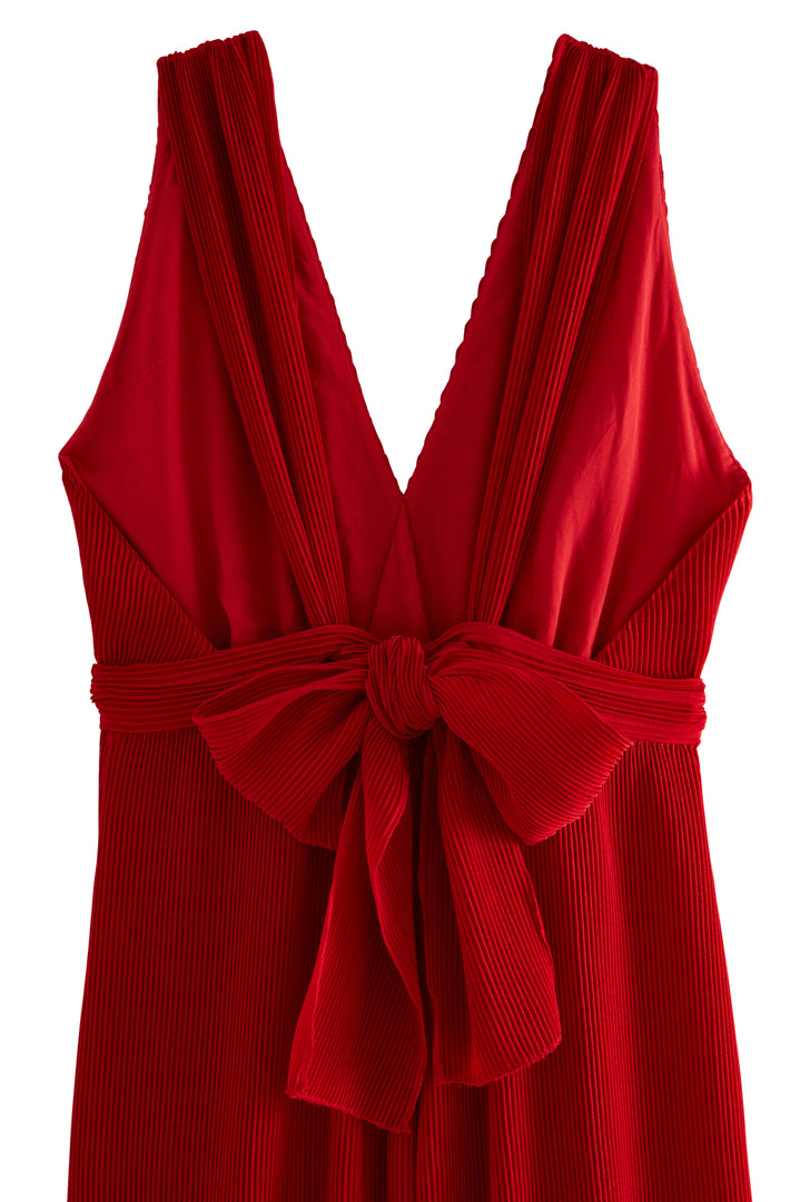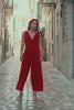 Designed in a rich red hue and pleated fabric, Margareta is the jumpsuit that turns heads. Its wrap-style top delicately highlights the neckline, while its open back ties—in any way you like—with adjustable straps, elegantly concealing the invisible closure.