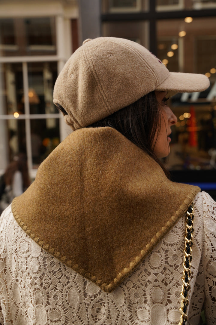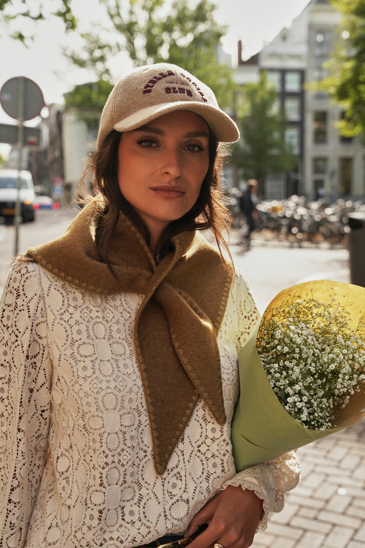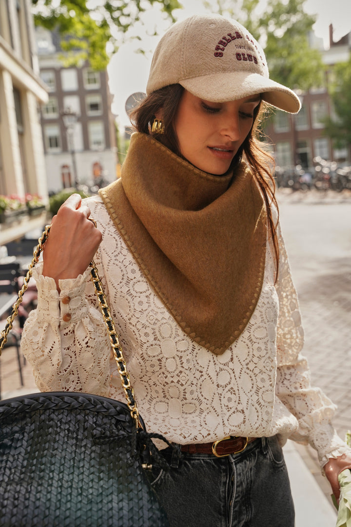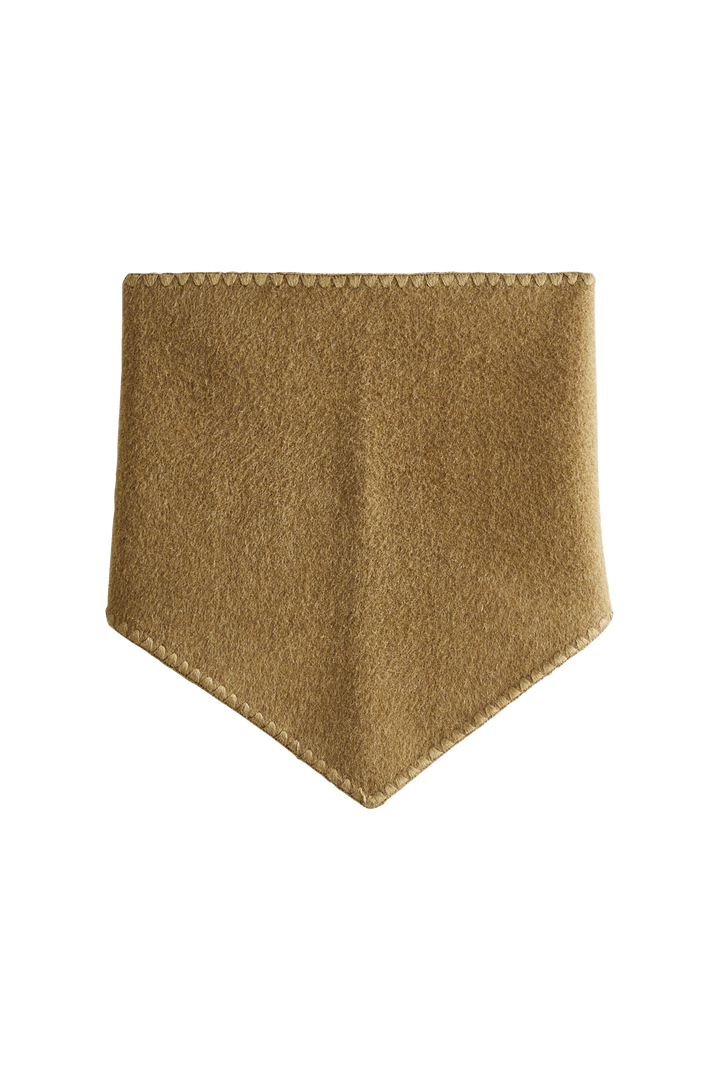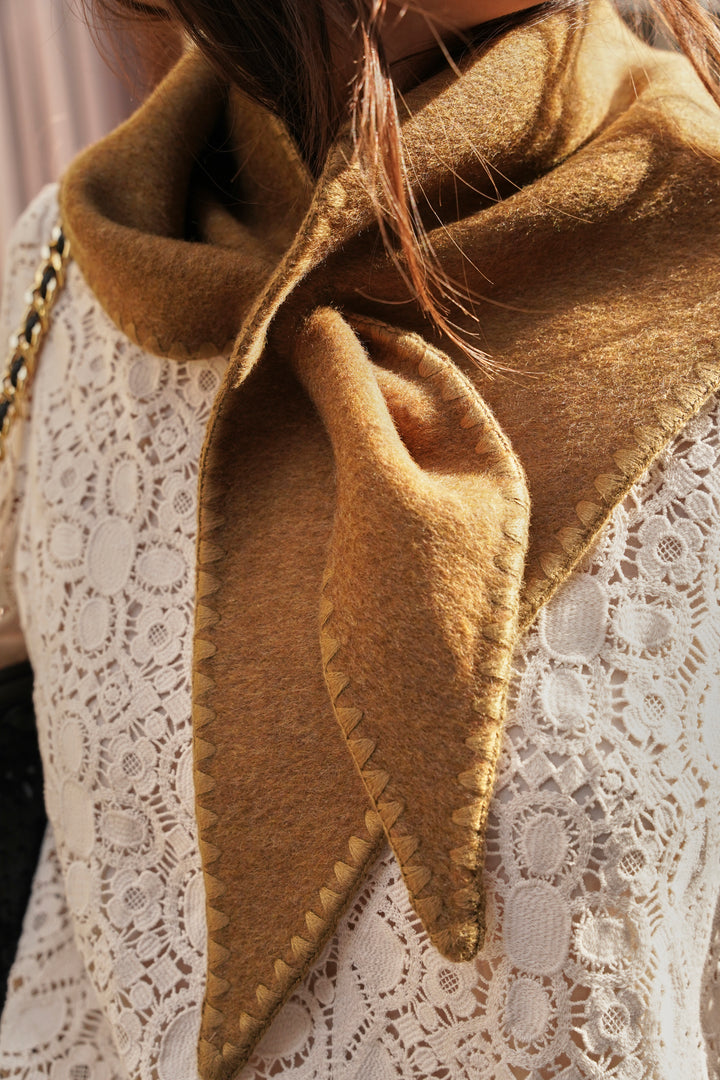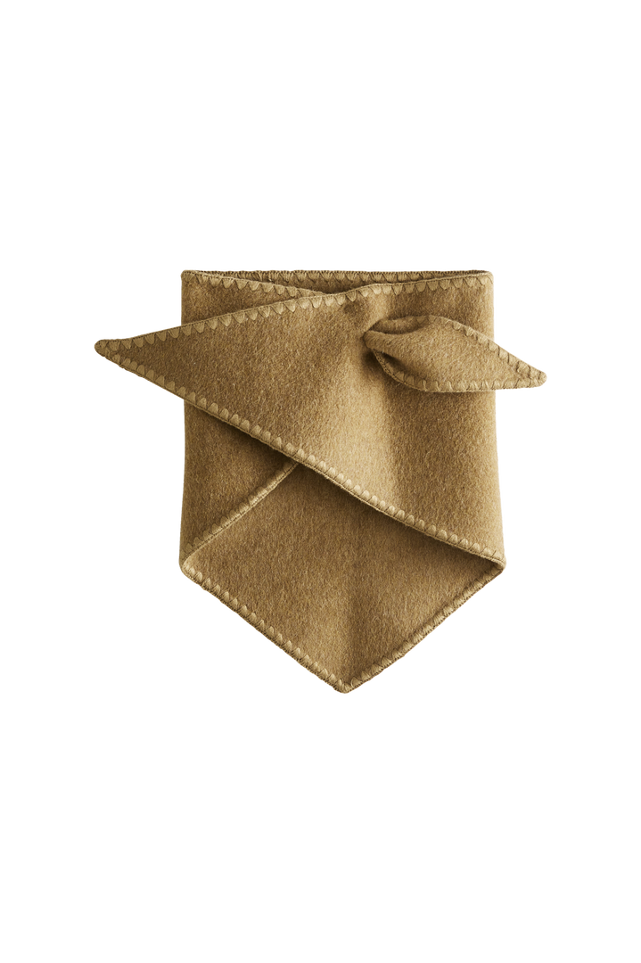 Its triangular shape in blended wool is distinguished by a clever button fastening that allows it to be easily tied around the neck. A tone-on-tone embroidery accentuates its edges, while its size (108 x 40 cm) offers multiple ways to wear it: tied in the front for a casual look or in the back for a more sophisticated style.