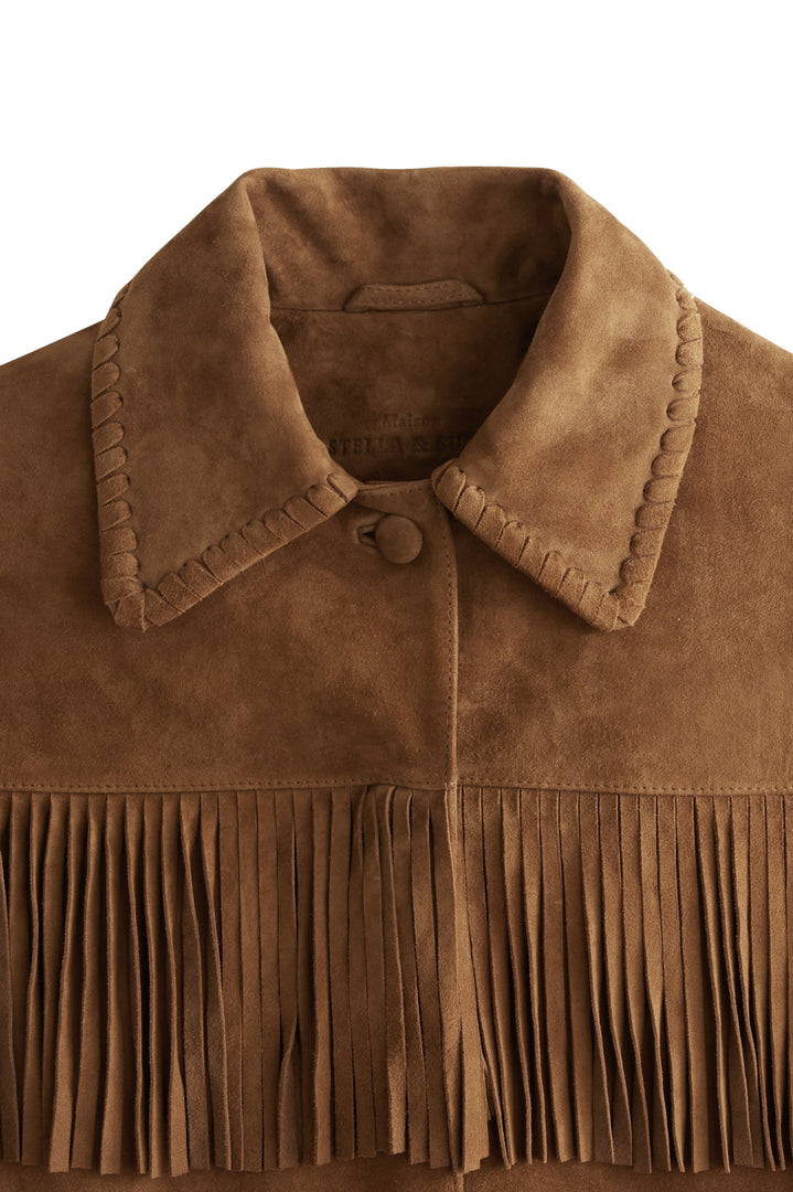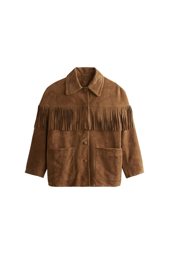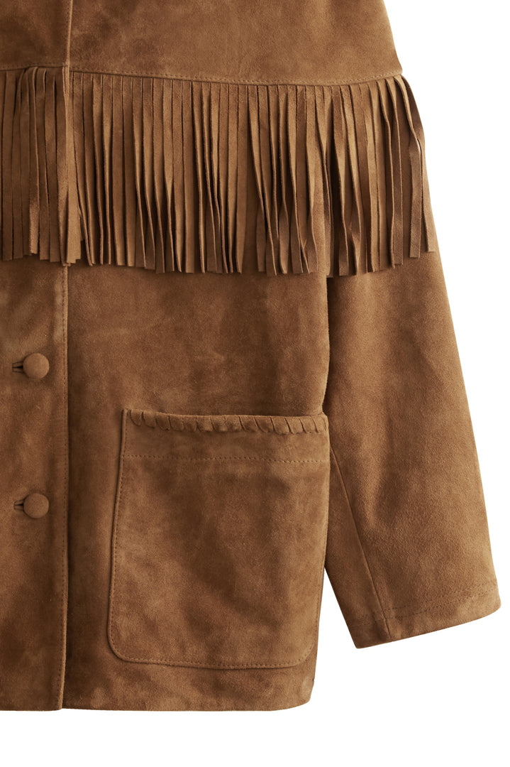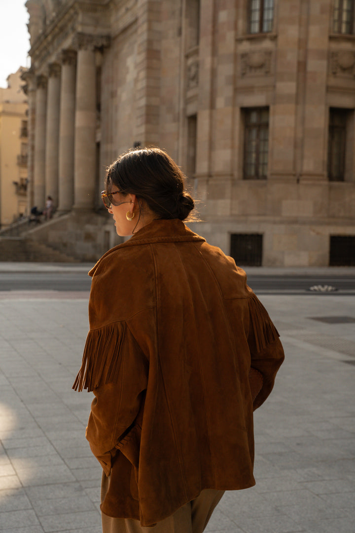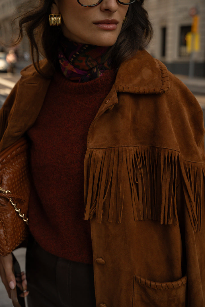 Made of genuine cognac suede, it captivates with its well-thought-out details: iconic fringes, covered buttons that blend delicately into the texture of the jacket, and scalloped edges on the collar and pockets. Its full viscose lining makes it a piece that is as comfortable as it is refined, designed to carry you through the seasons with style.
