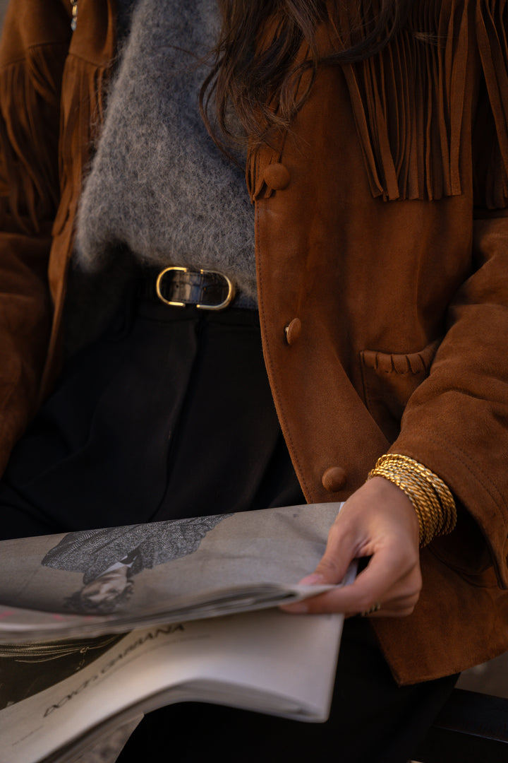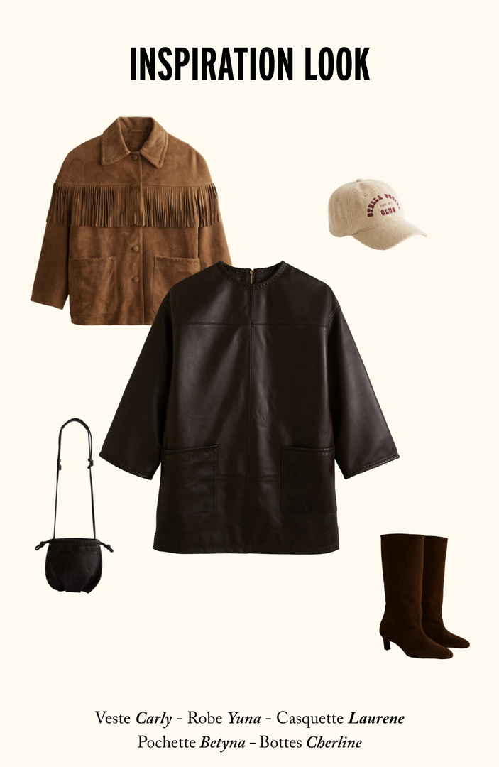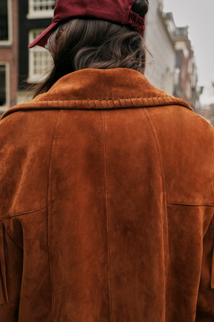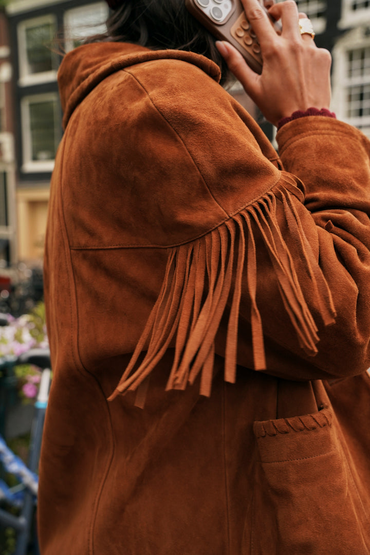 Carly is the season's standout piece. This suede coat makes us love autumn and warms up any look. Its style, with its modern take on western chic, is undeniably eye-catching.