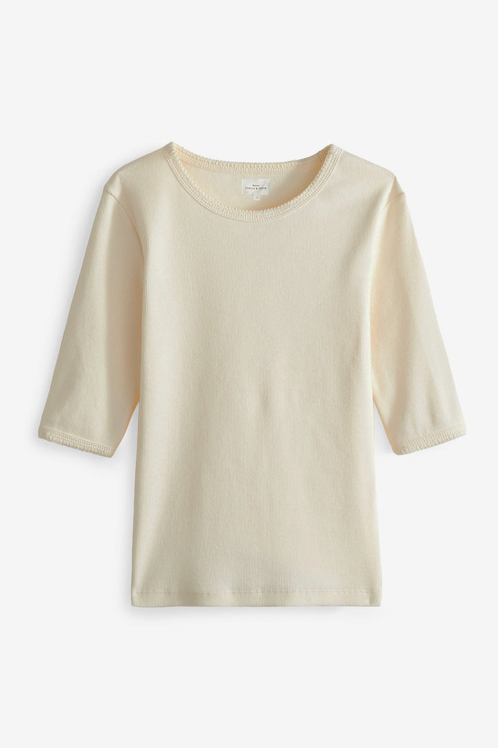 This ribbed knit top hugs the figure thanks to its close fit and timeless three-quarter sleeves. Its soft fabric makes it an ideal everyday base.
