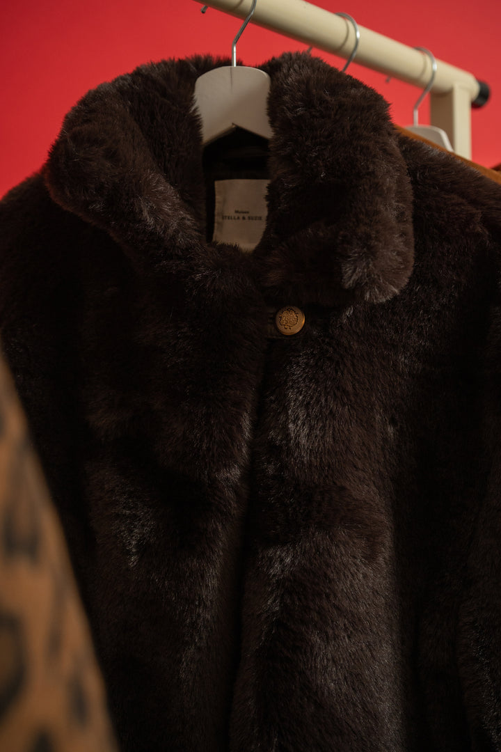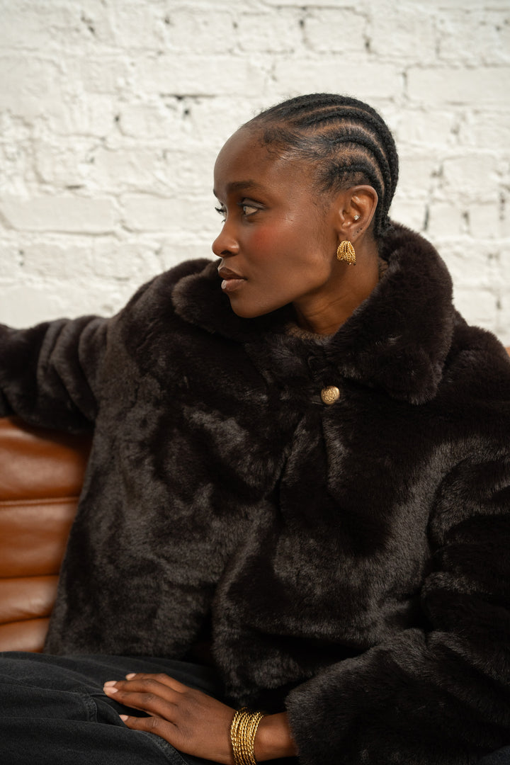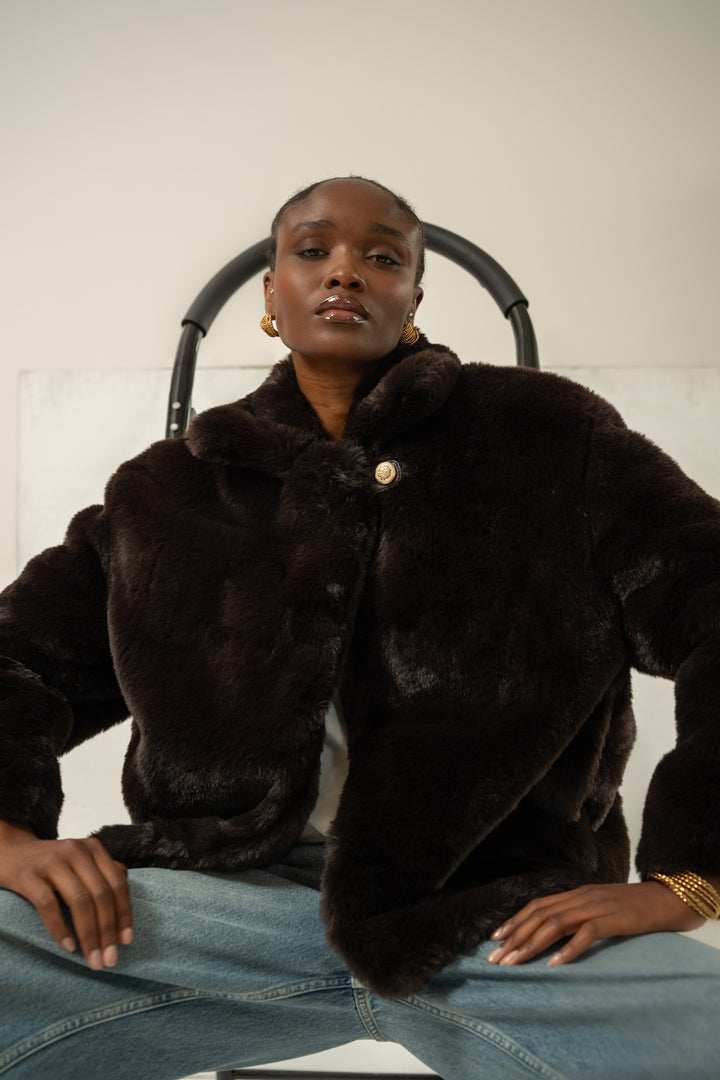 Its soft and voluptuous texture envelops you in elegant warmth. Its classic collar is enhanced by a delicately chosen jewel button. Inside, the leather finishes, always LWG certified, reflect the care given to every detail by the House. The best ally to face the cool days of winter, while remaining chic and cocooning. It will be perfect in everyday life on the wide Salma jeans. And for a more dressed up look, we wear it with the Alexa leather pants.