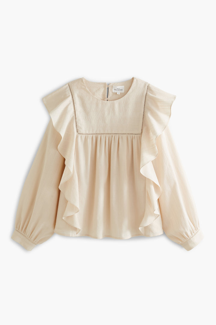 Two wide ruffles adorn the shoulders and extend delicately to the bottom of the blouse.