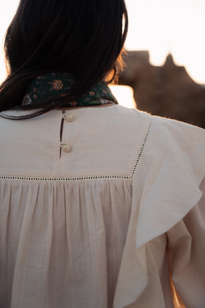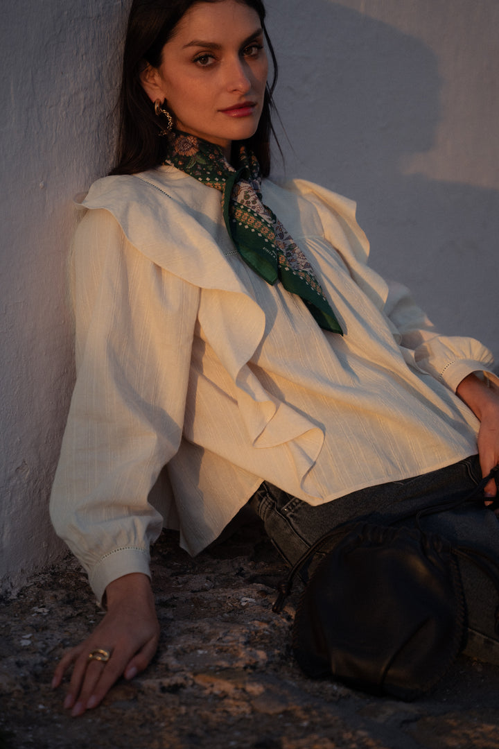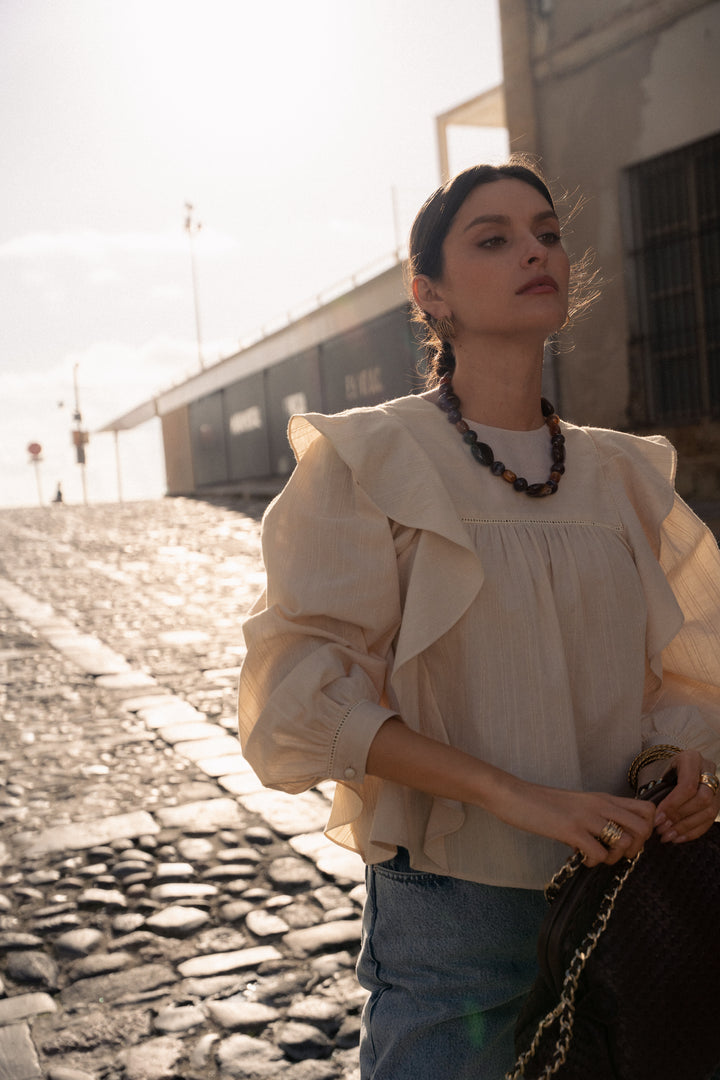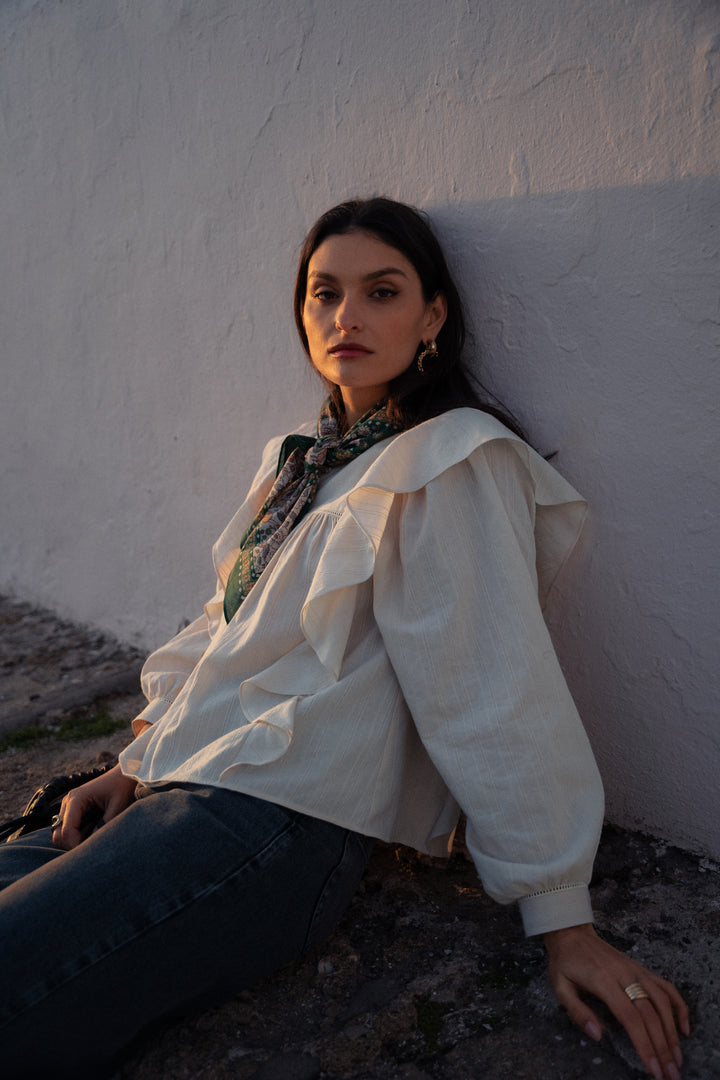 An elegant and romantic blouse, which can be worn daily with our Benji jeans, either in light washed denim or in the Bella Black version for an even more elegant look.