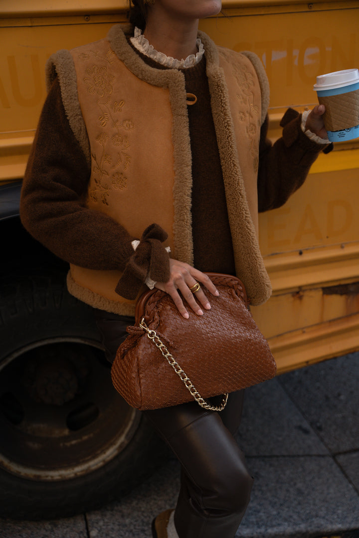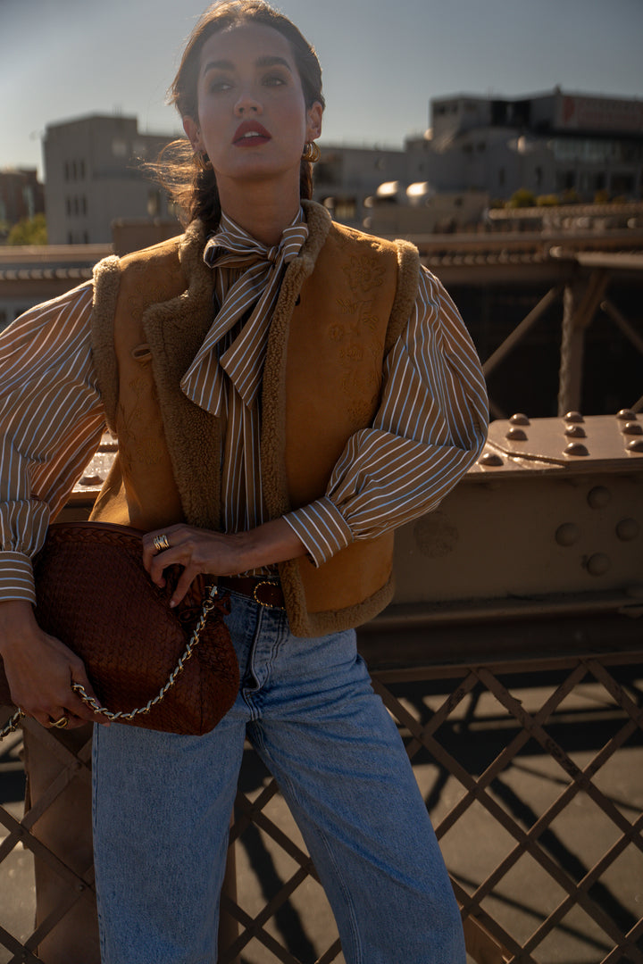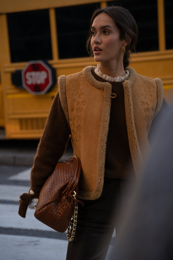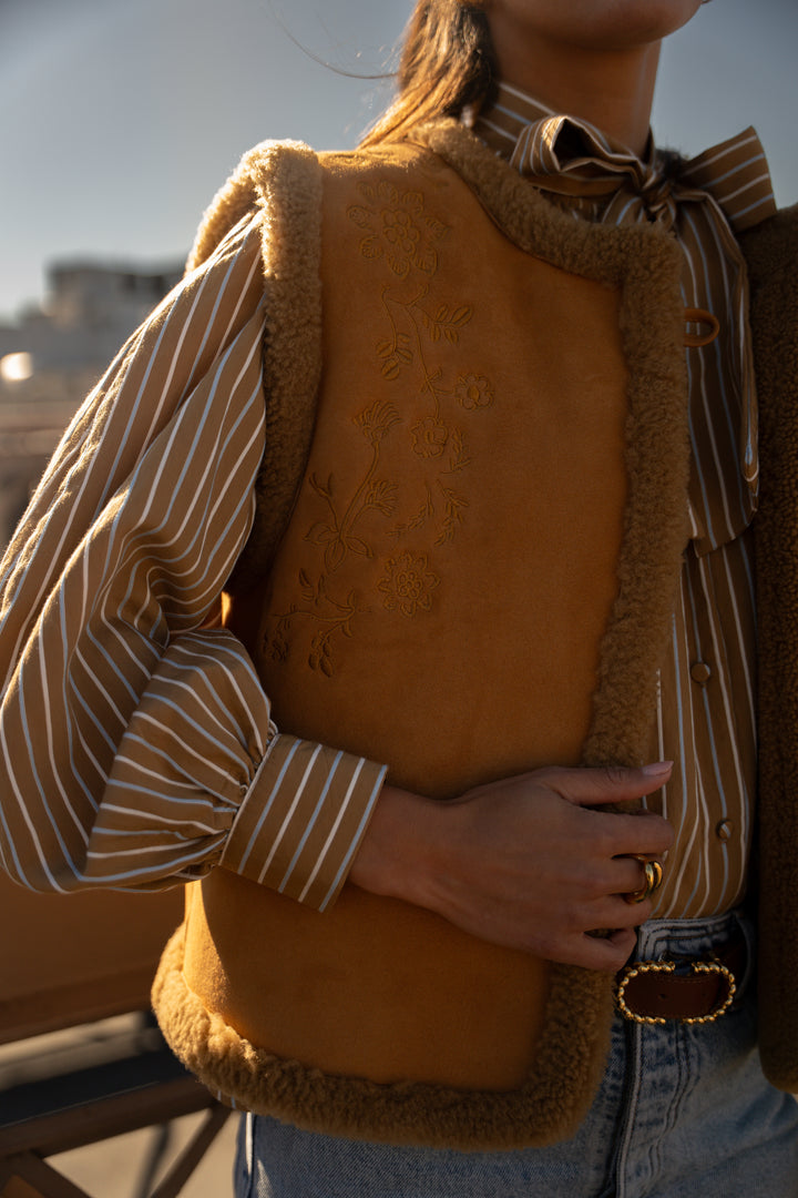 The Iker sleeveless sheepskin coat is appealing thanks to the combination of its material and delicate embroidery.