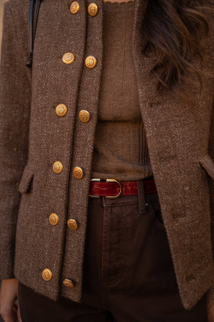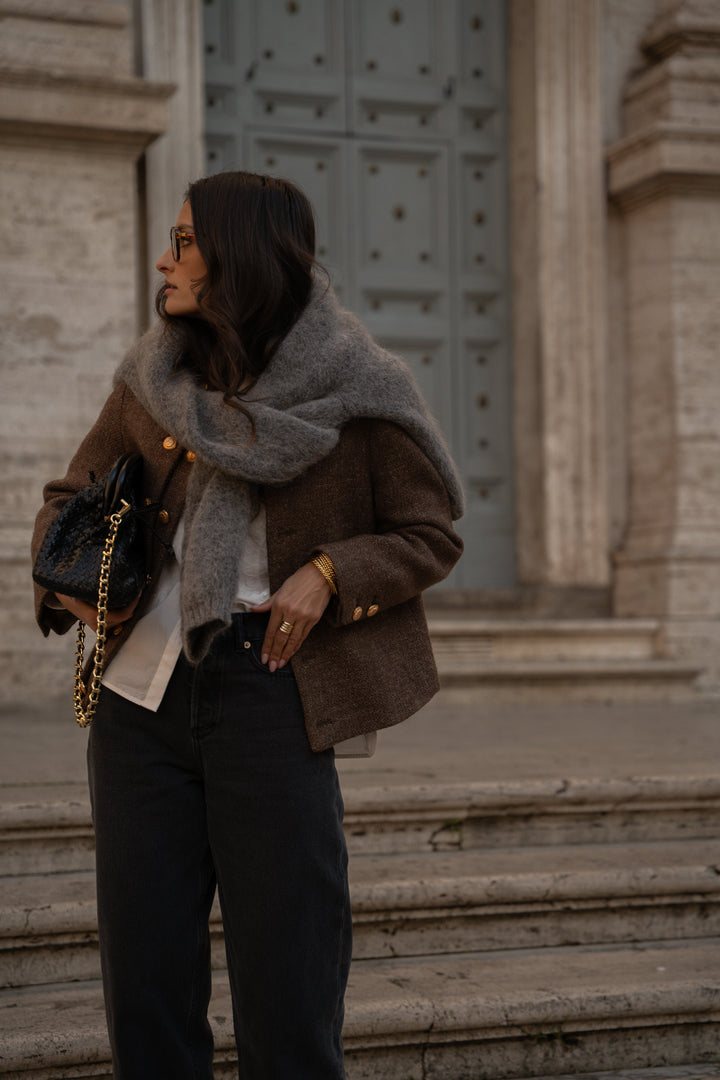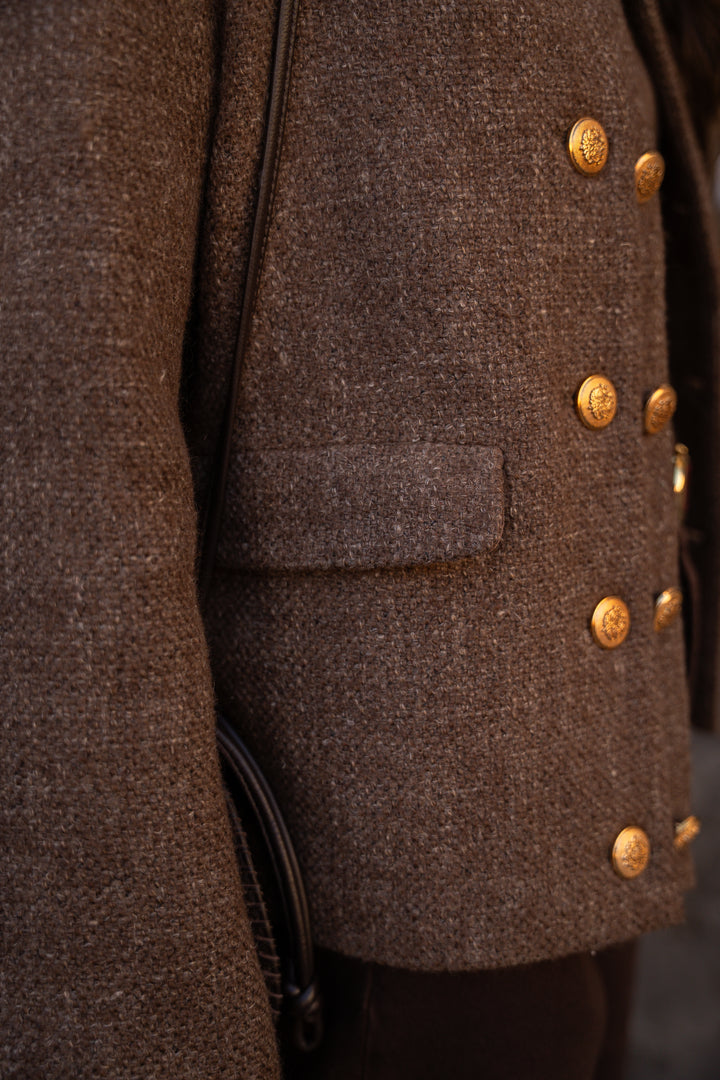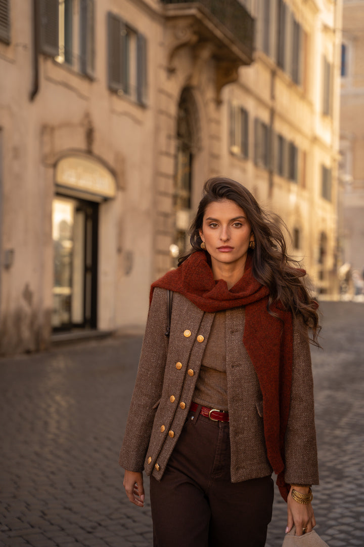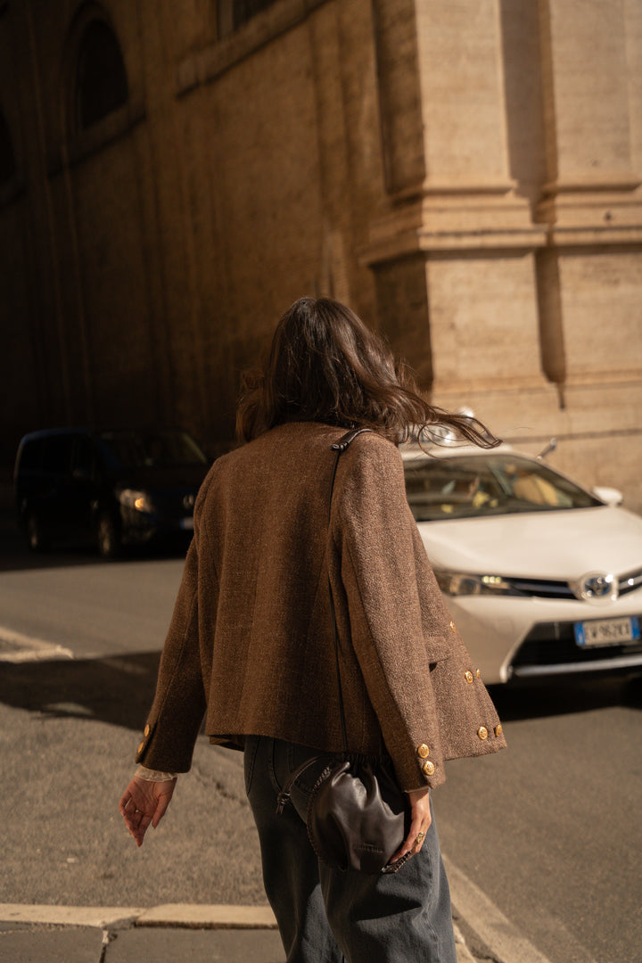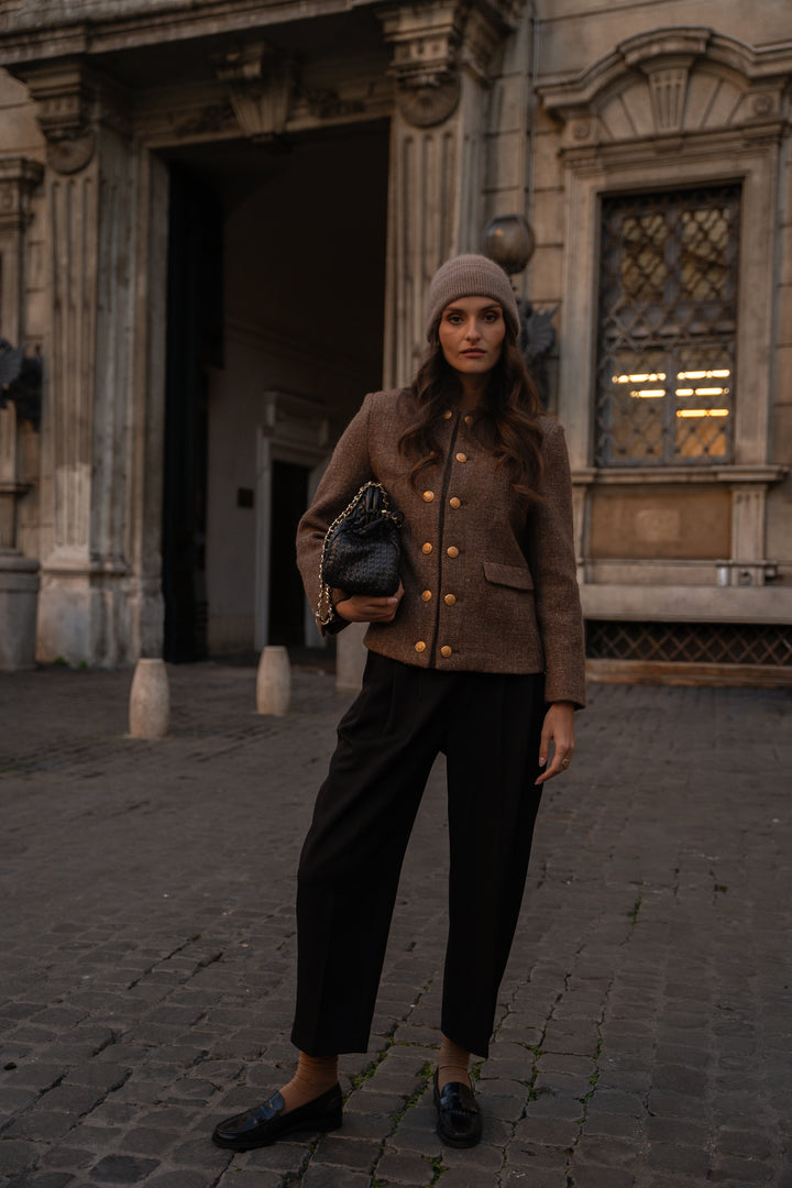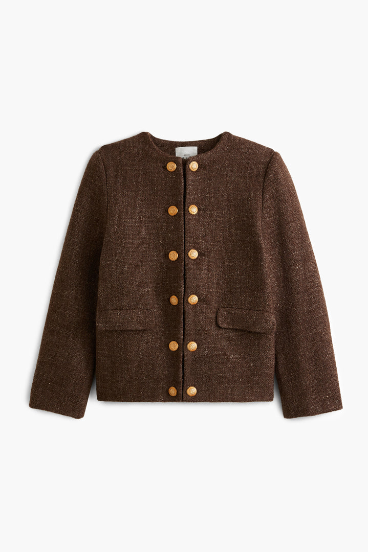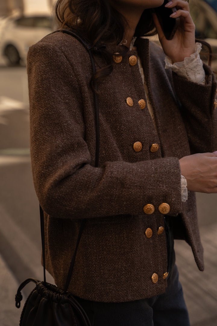 Frédérique, the jacket with discreet charm that accompanies all your days: its heathered brown warms the silhouette and creates a naturally elegant style.