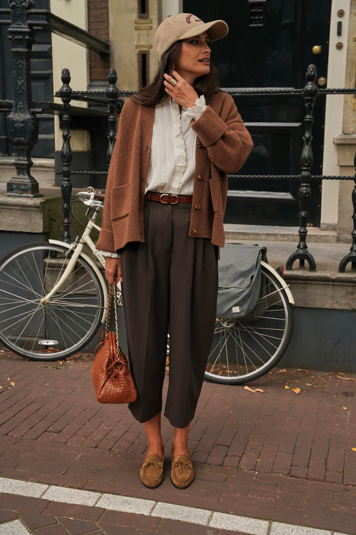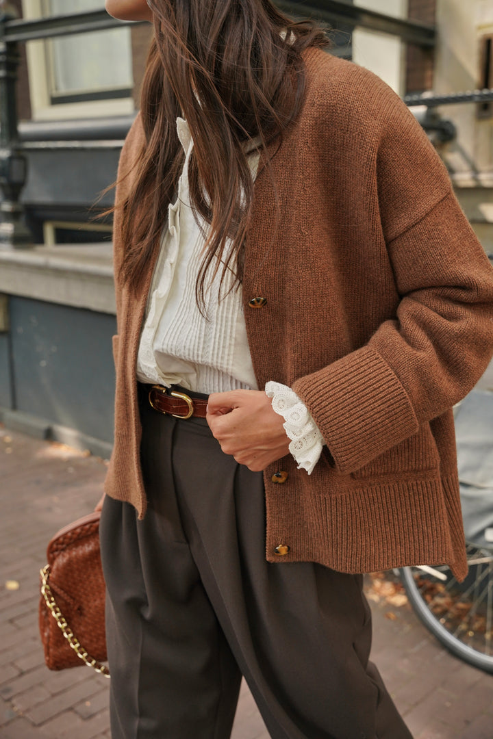For an autumnal look, pair it with our Vinca blouse with lace details, and the Luis cardigan in its Mocha color.