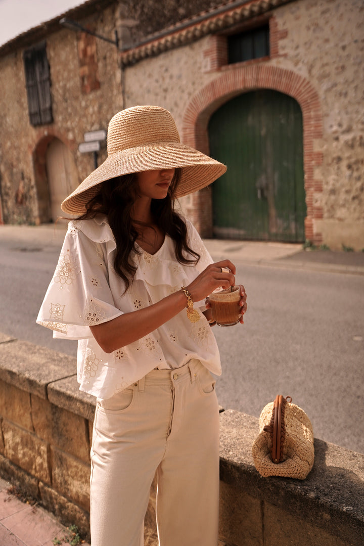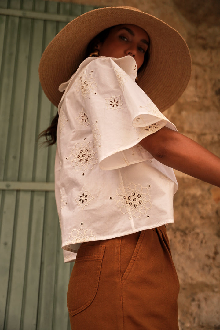 The romantic Nathaly blouse features an ecru cotton fabric, delicately embroidered with flowers for a soft look.