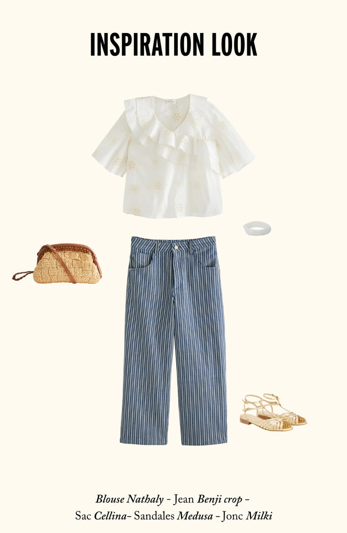 We love it with the tobacco-colored Pommy Bermuda shorts and pretty gold accessories. A look full of contrasts for a decidedly trendy look.