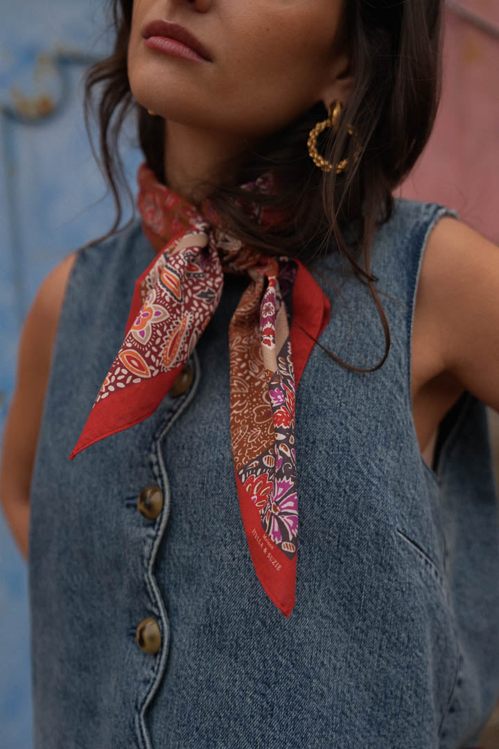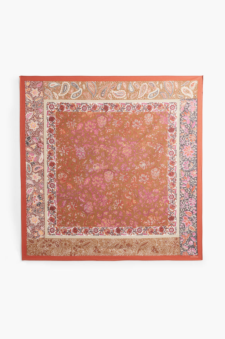 Our beloved Alda scarf is now available in a new "Marani" print. A vibrant print, a blend of flowers and paisley, delicately placed on a sparkling orange background.