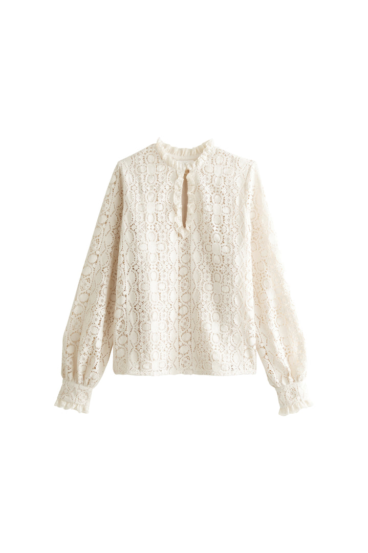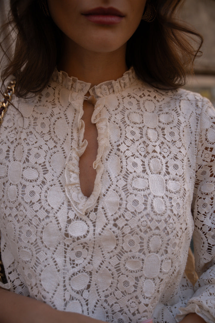 Its high, gathered collar opens to reveal a teardrop opening fastened with a horn-effect button, while its long sleeves are adorned with buttoned cuffs and refined ruffles.