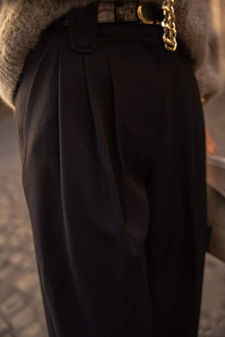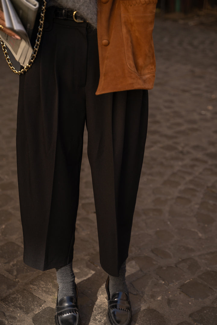 Doris, our tailored dress pants with a cropped and wide cut, is available in a deep black!