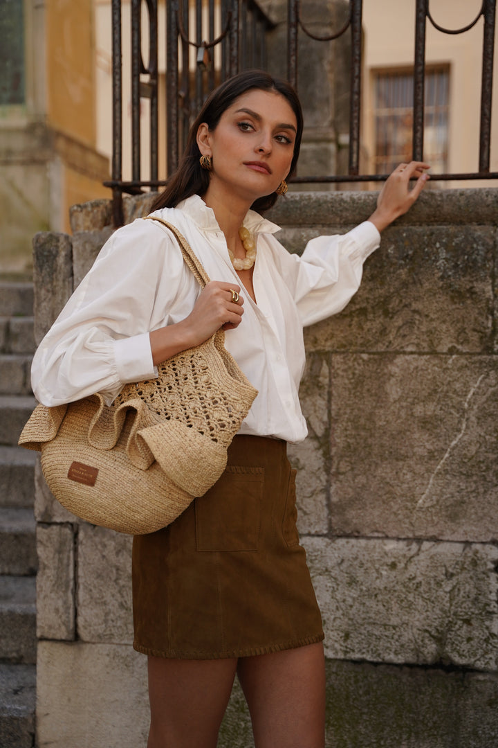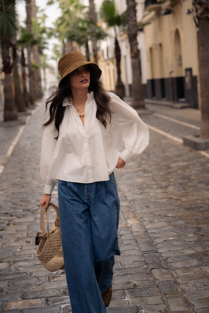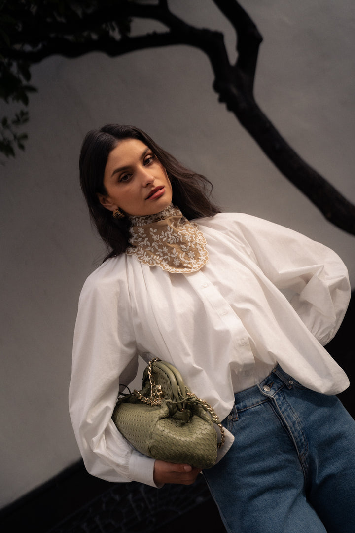 Made from 100% cotton, it impresses with its fluid drape and the small gathered ruffle that frames the collar, like a delicate signature.