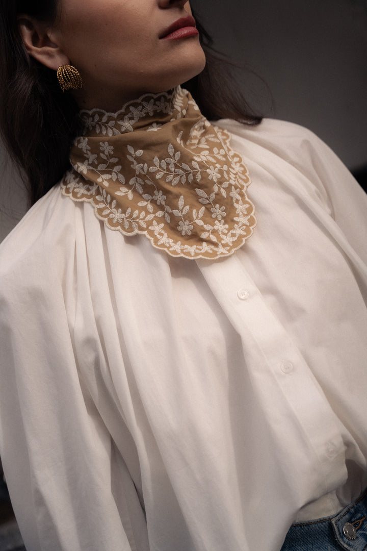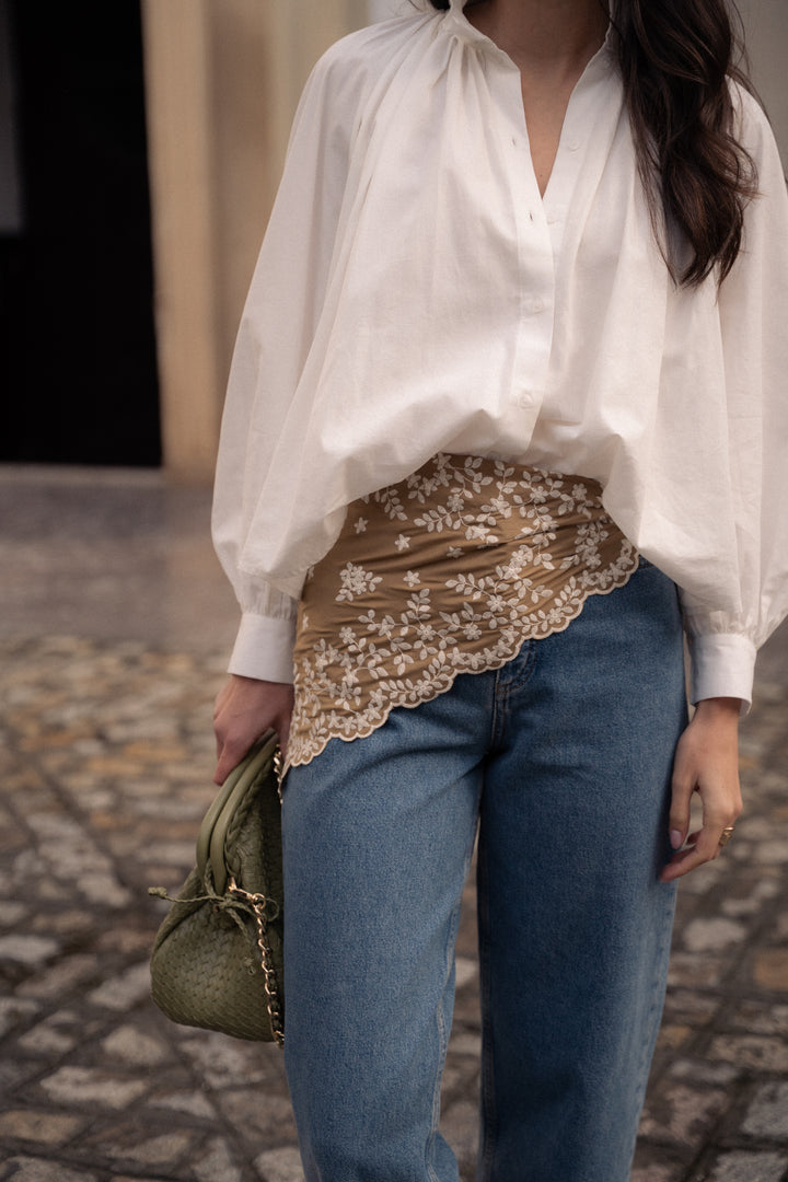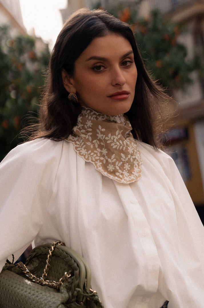 Made from the same fabric as the Ilmania blouse, fully printed and embroidered, it impresses with its material and scalloped finishes.