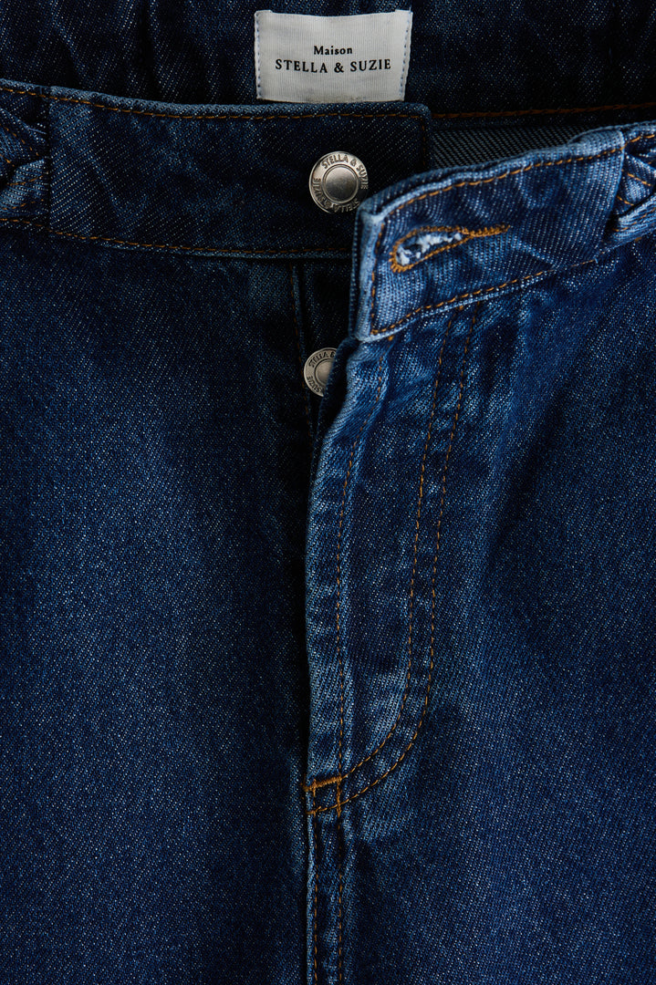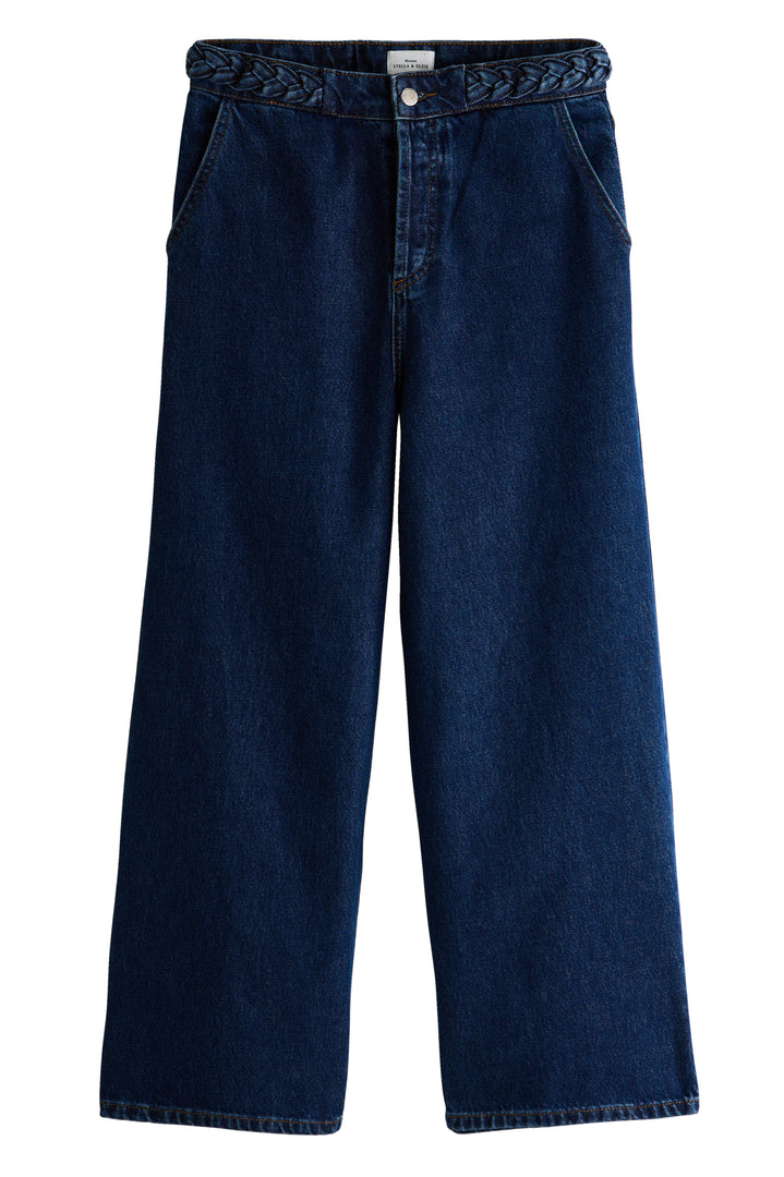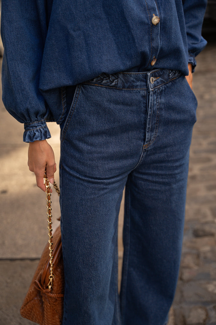 We love its straight cut and wide legs, which combine comfort and elegance for a perfect silhouette, while remaining easy to wear every day. This model is distinguished by its belt adorned with a real denim braid, adding a touch of originality and refinement, as well as its Italian pockets on the front.