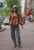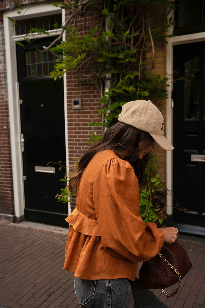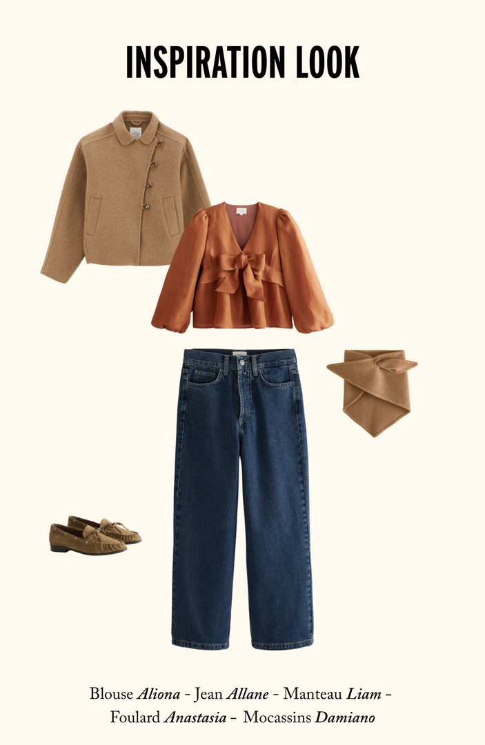 A piece designed to be worn every day, over our Allane jeans in a faded gray that brings out all the brightness of the blouse. Add the beige Laurene cap for an even more modern look.