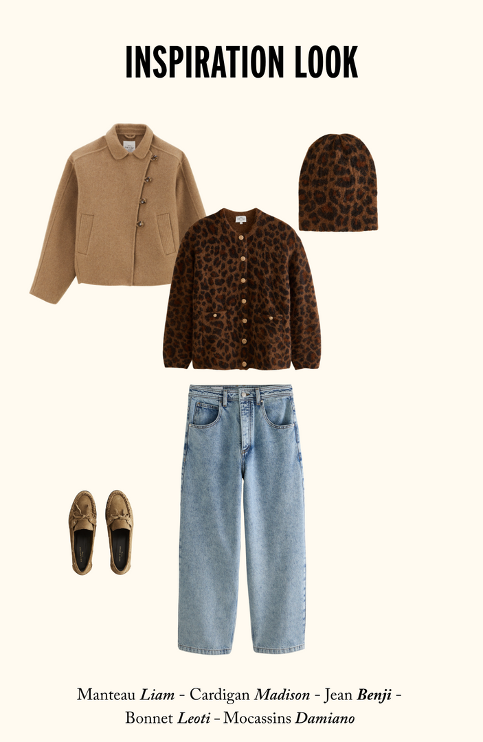 I absolutely love the collar of the Vinca blouse, which peeks out from the neckline of the vest! And for the bolder among us... opt for a total leopard look by adding the Anastasy scarf and the Leoti hat.