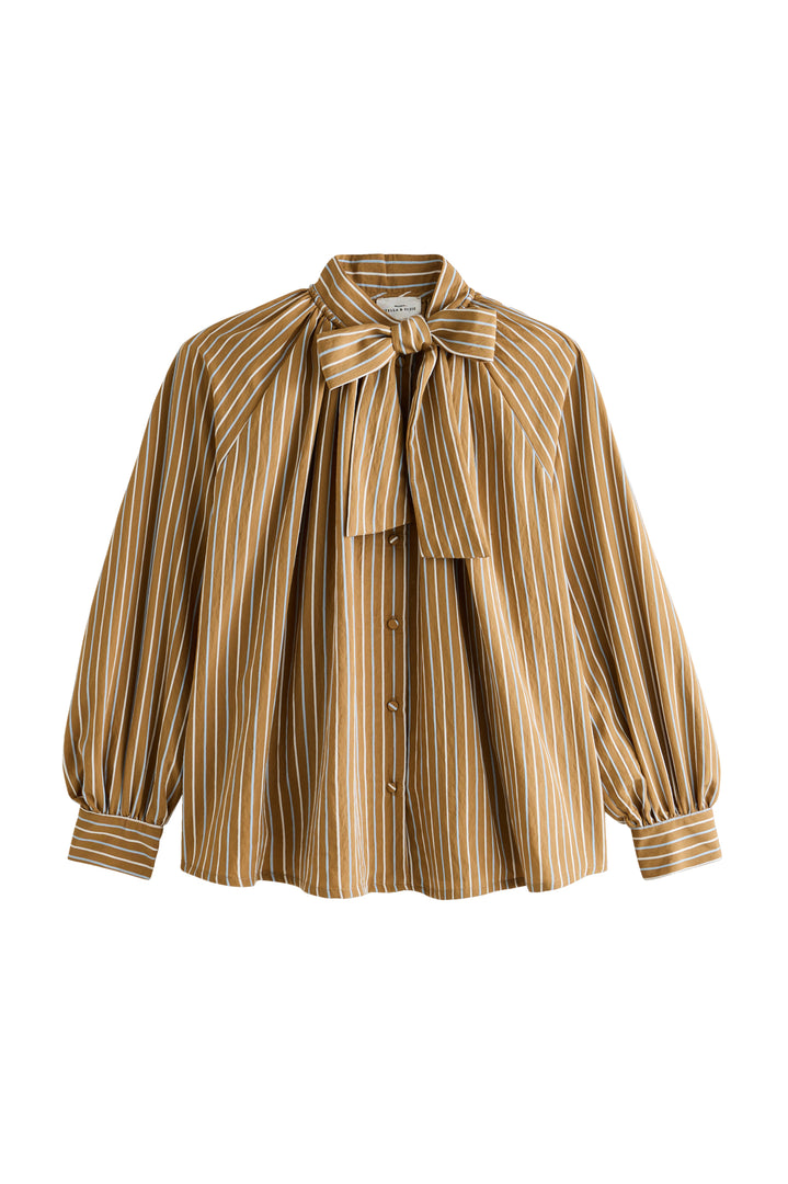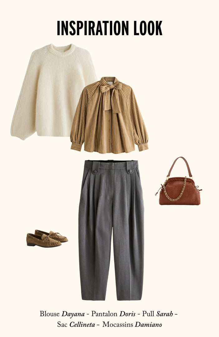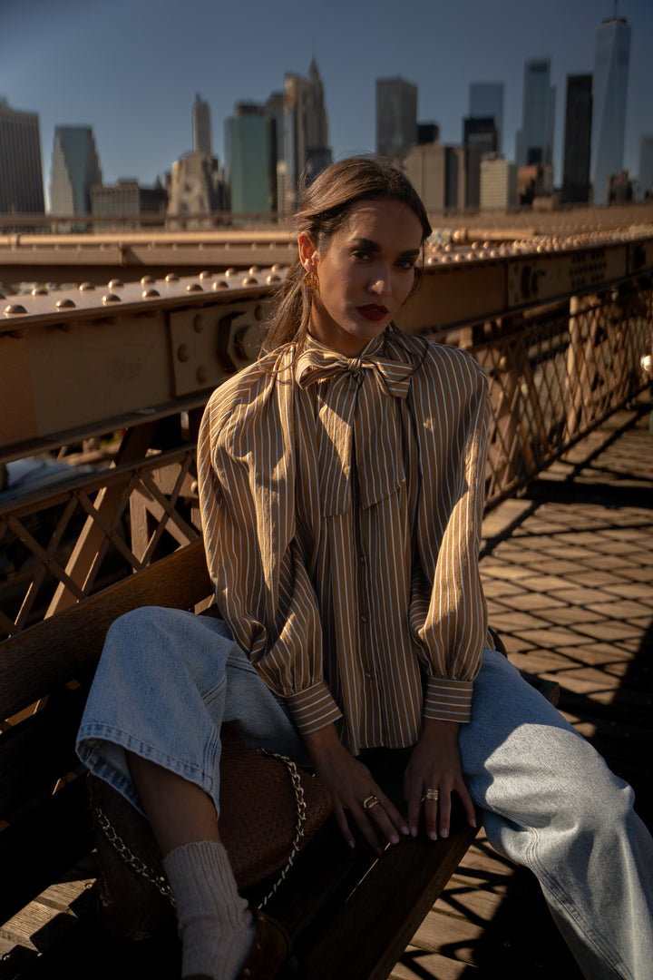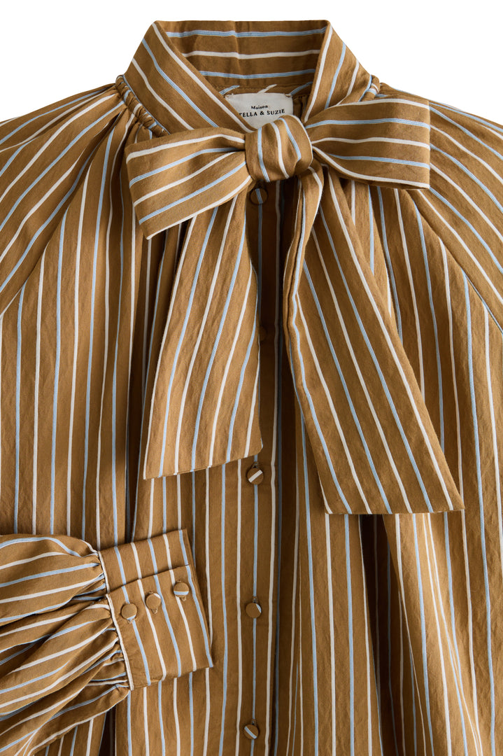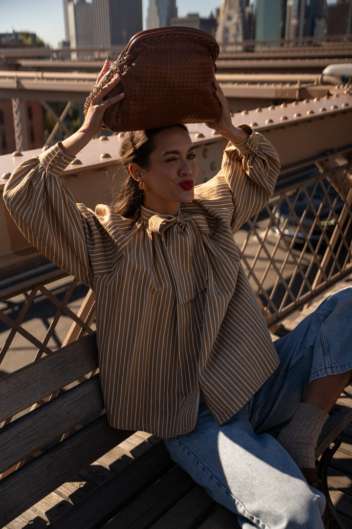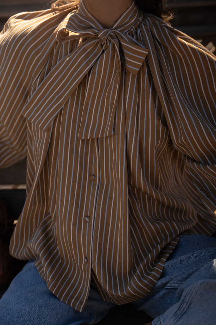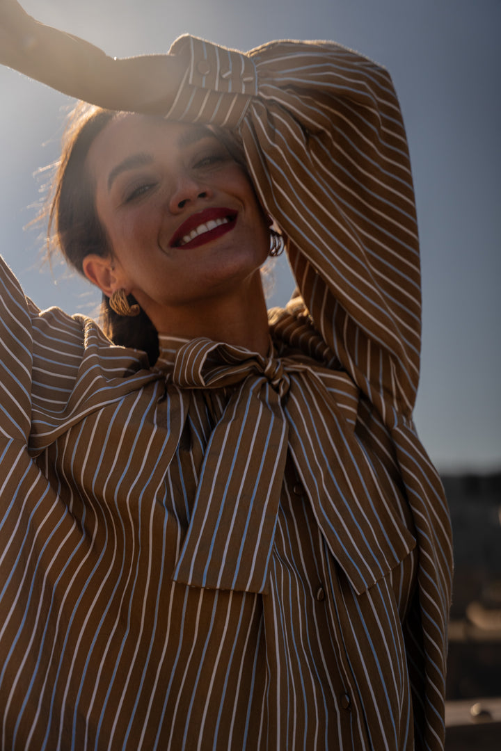 The Dayana blouse, a favorite for its refined volume and sophisticated look, stands out once again thanks to a beautiful camel-striped print.