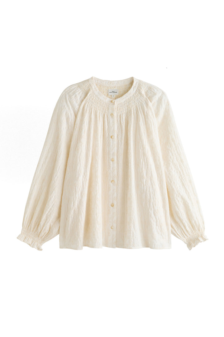As for its smocked collar and cuffs, they add a subtle touch of structure while creating a pretty play of volume.