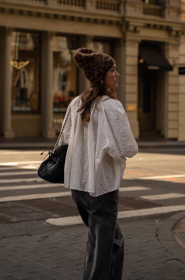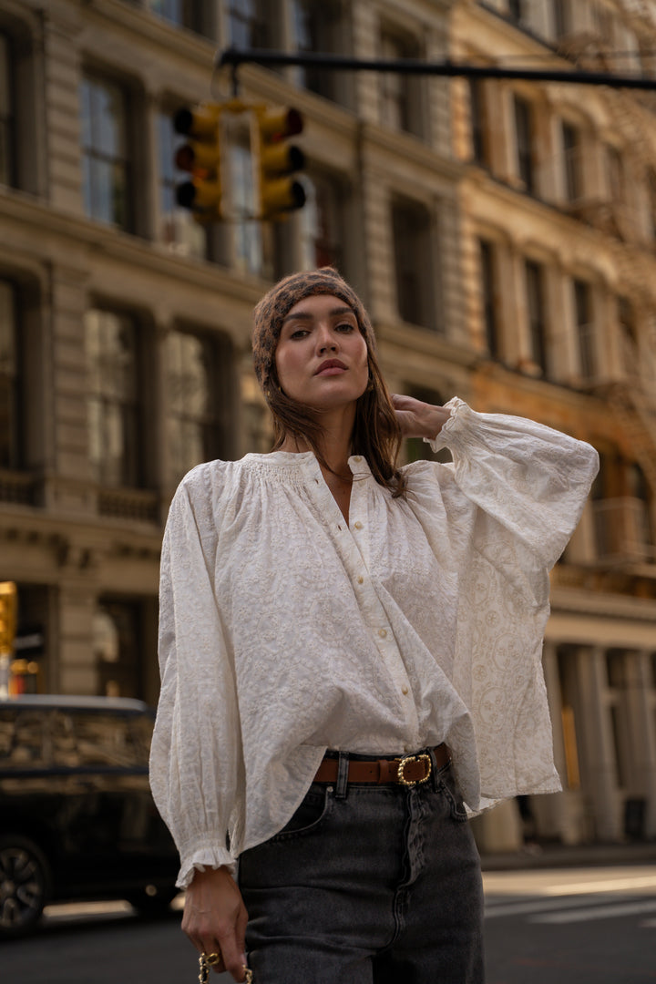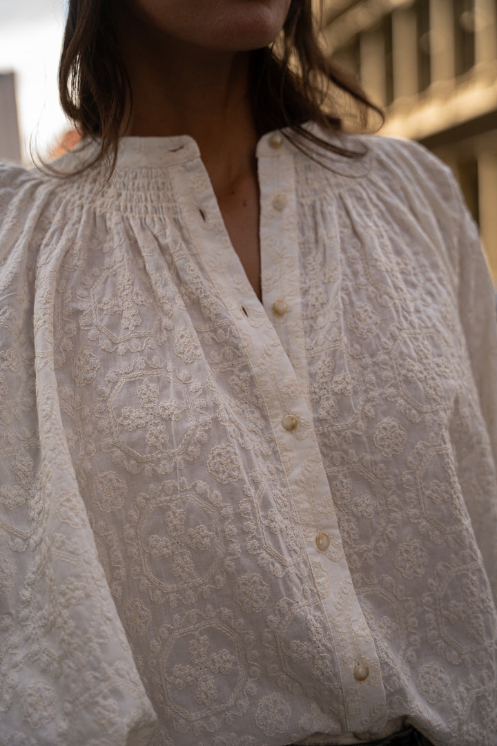 The Ilma blouse captivates us with its airy volume and finely crafted embroidery, made in a new, more visually appealing fabric, for a unique charm.