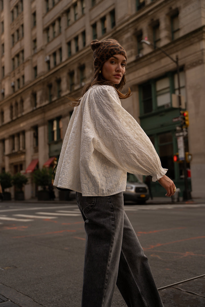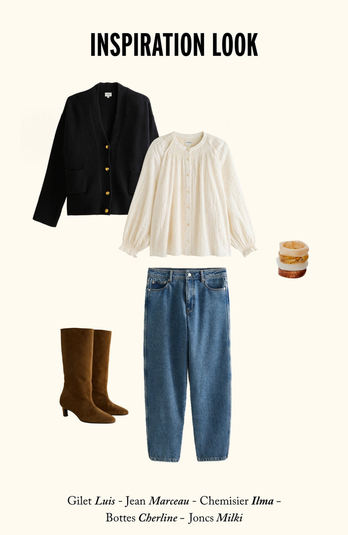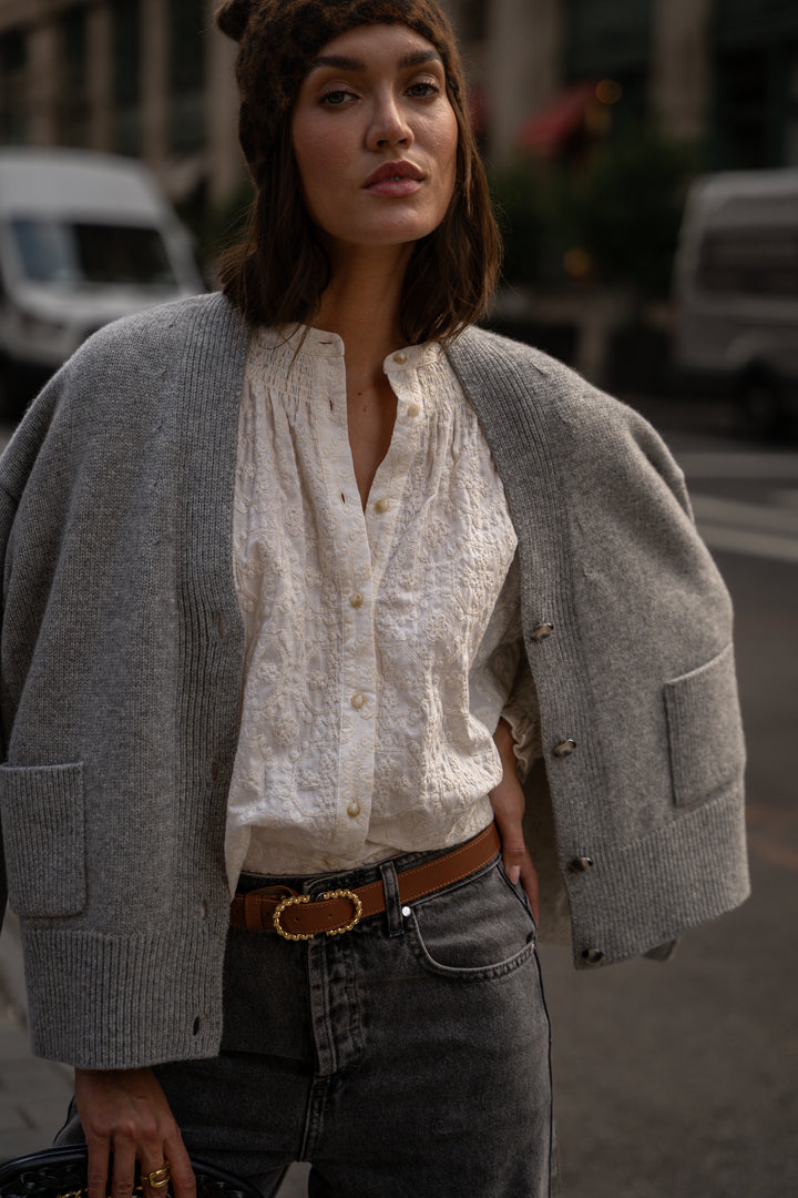 We love pairing it with the Benji jeans in their faded gray color, which brings out all the delicacy of the embroidery. For the cooler days, add the heather gray Luis vest, which completes the look perfectly.