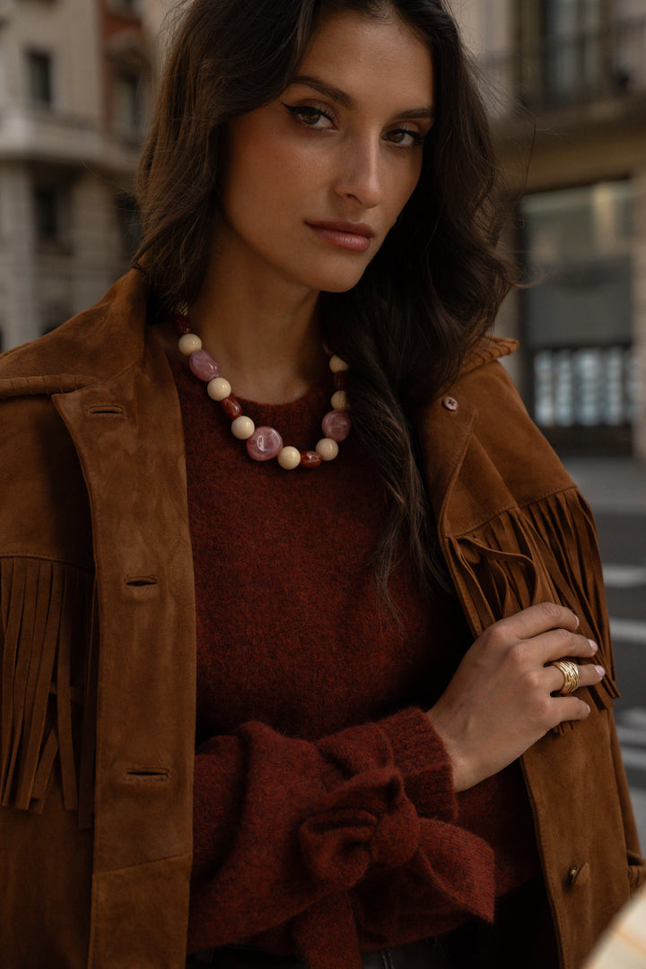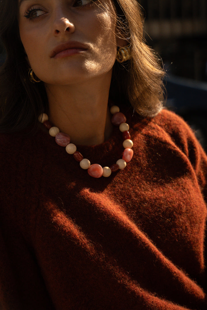 The Olpha necklace brightens your silhouette with its play of shapes and colors in shades of orange-pink.