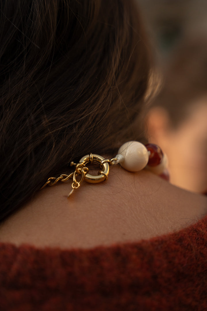 Composed of resin beads in varied shades, it is adorned with a rounded gold-plated brass clasp and a delicate adjustment chain, finished with the signature Stella & Suzie flower.
