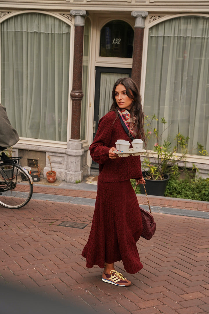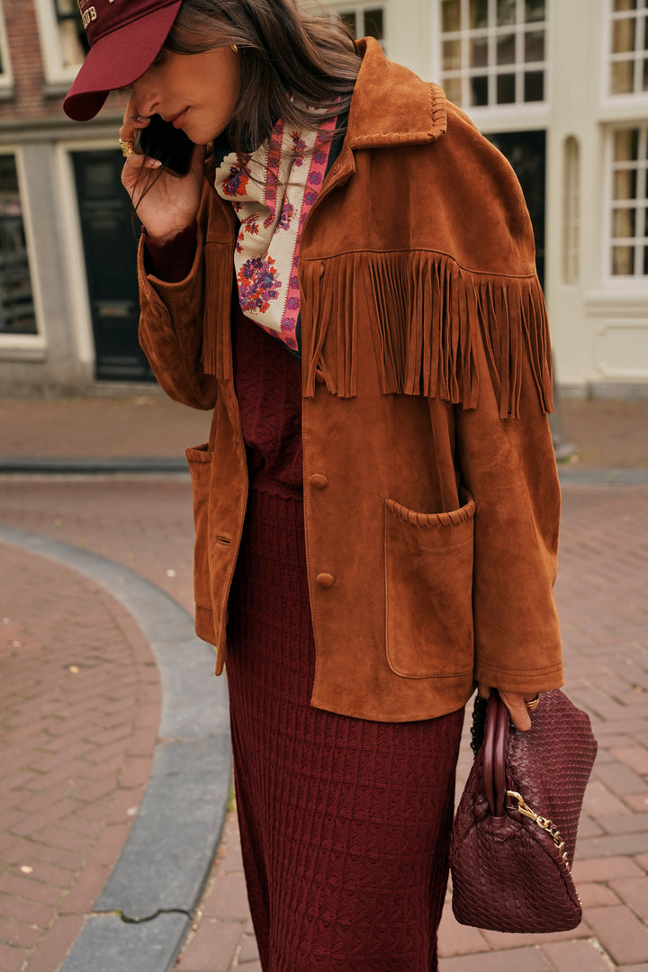 To complete the silhouette with refined details, add burgundy accessories: the Cellineta bag, the Alda scarf, and don't forget the Laurene cap. For the cooler temperatures of the late afternoon, complete the look with our Carly suede coat.