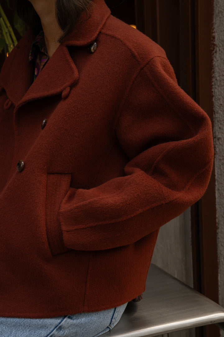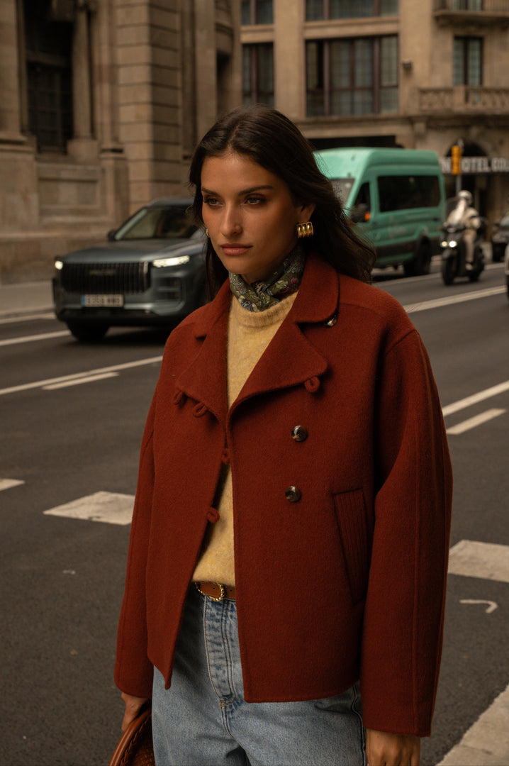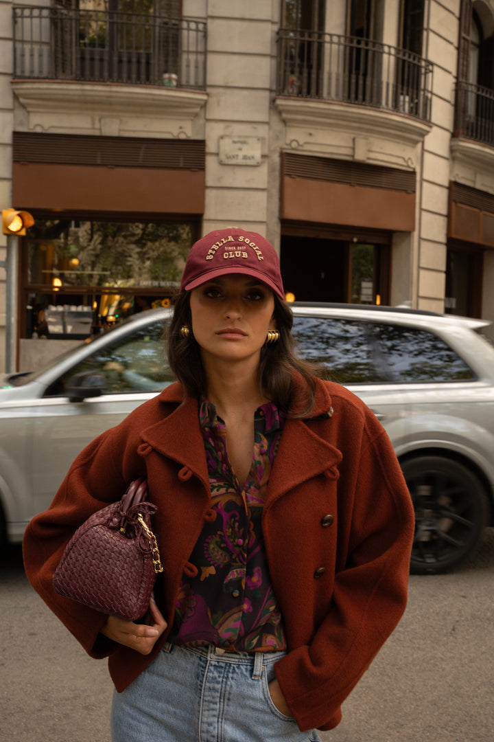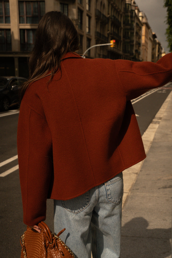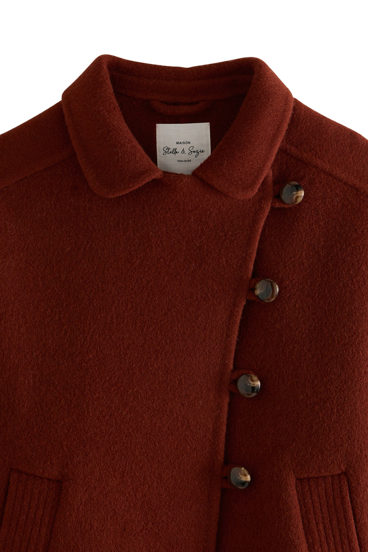 A winter favorite, the Liam coat returns in a bold new version: a luminous mahogany color with timeless charm.