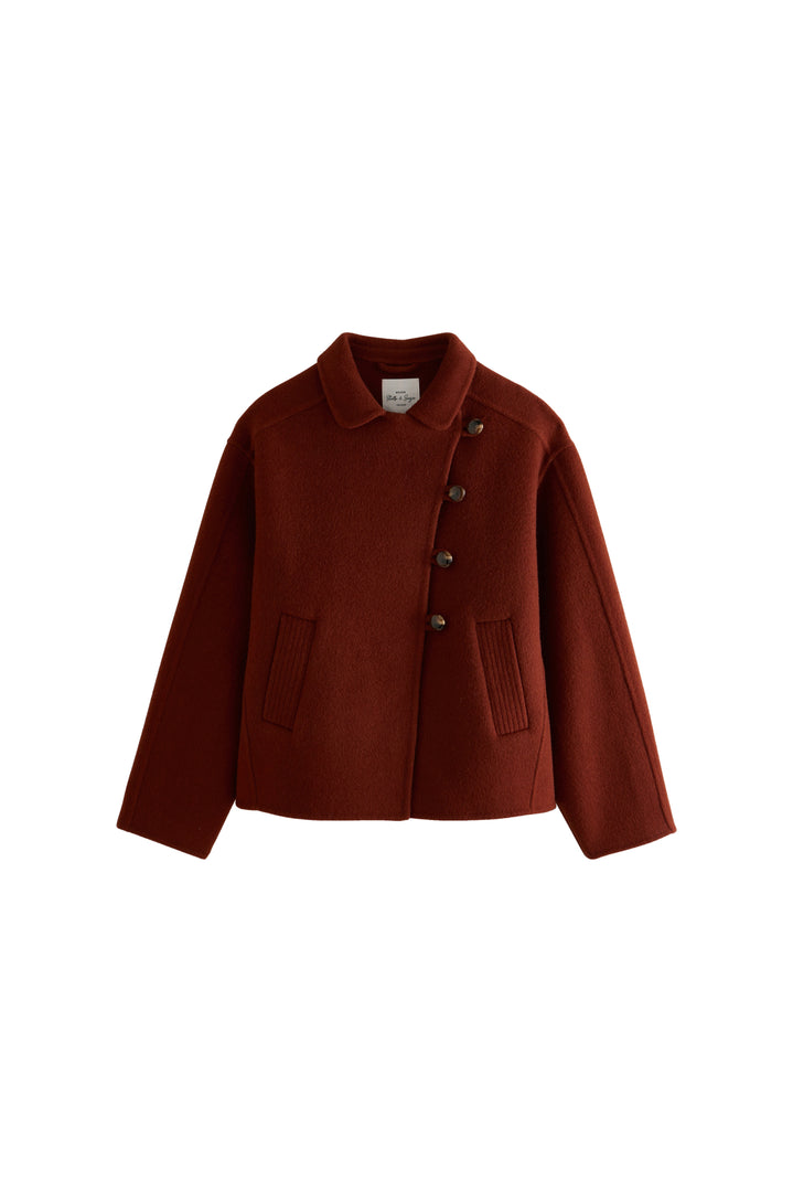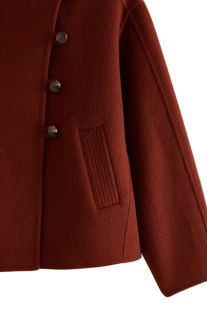 Its short, oversized cut, off-center armholes, and diagonal buttoning adorned with horn-effect buttons create a refined and decidedly modern silhouette. Delicate stitching emphasizes its line with dynamism.