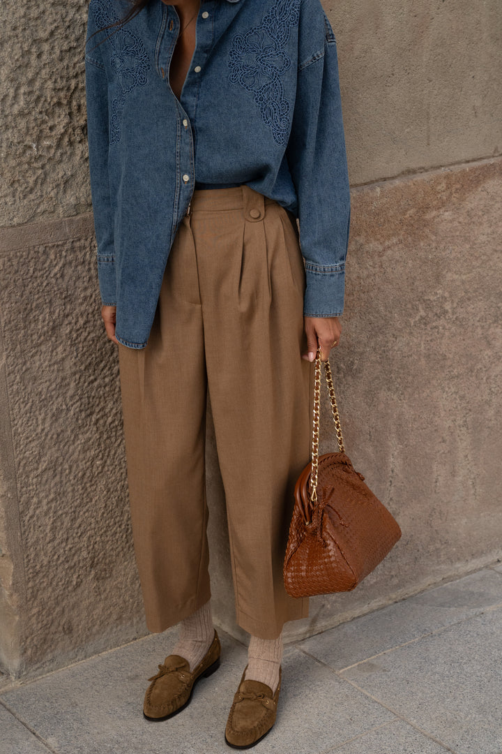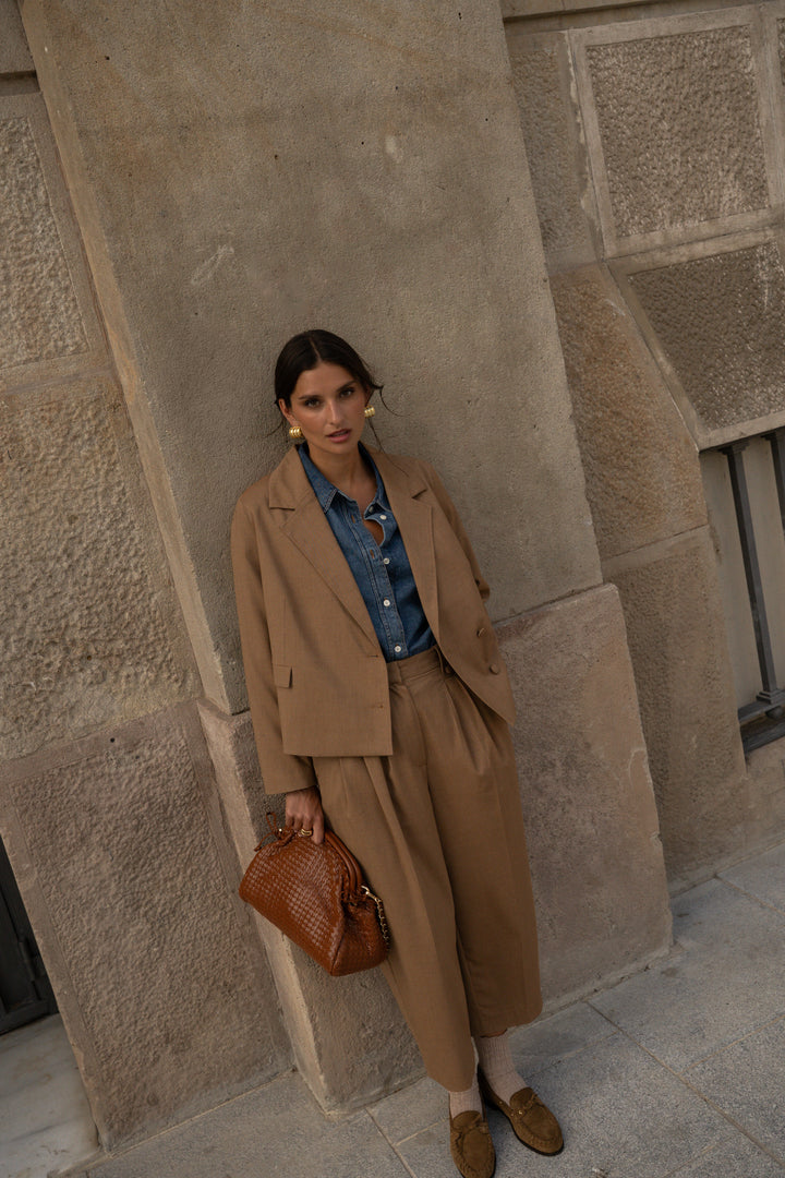 Doris, our tailored, cropped, and wide-leg dress pants, comes in a light brown "cafe latte" color this season that will warm up all your looks. An easy color to combine with our blouses and seasonal jackets.
