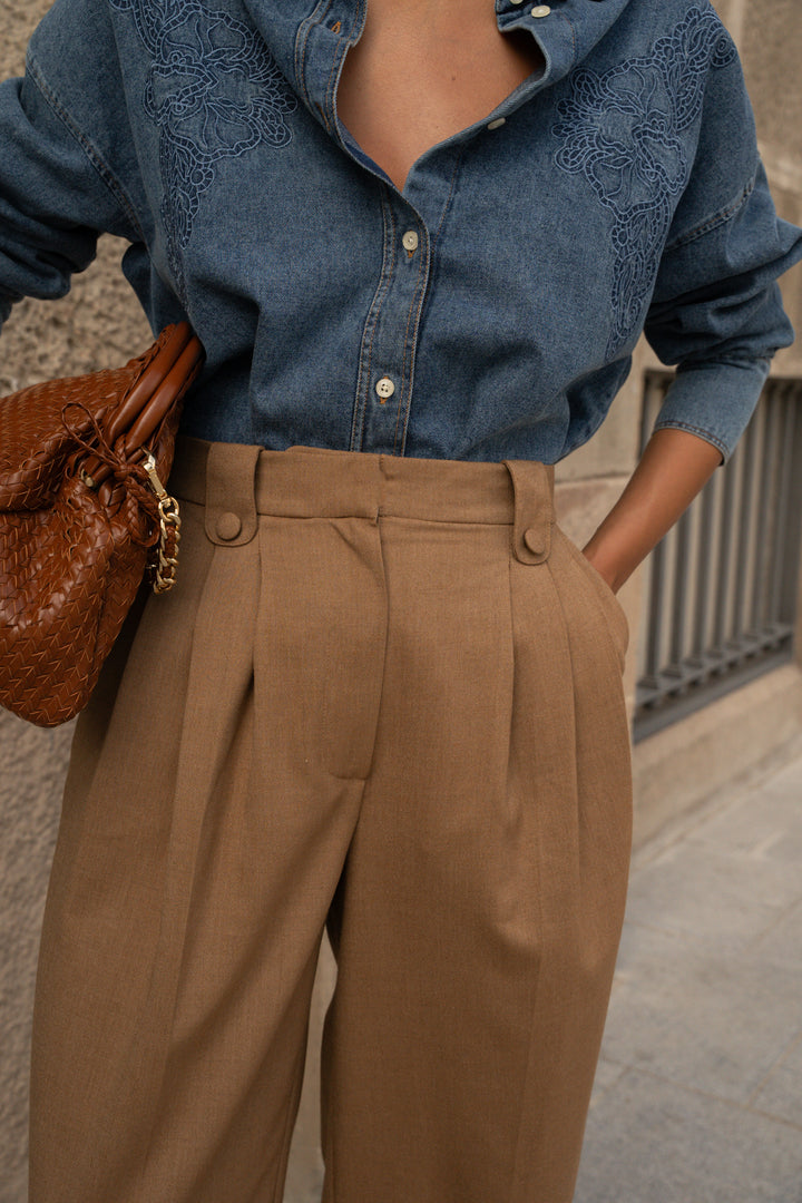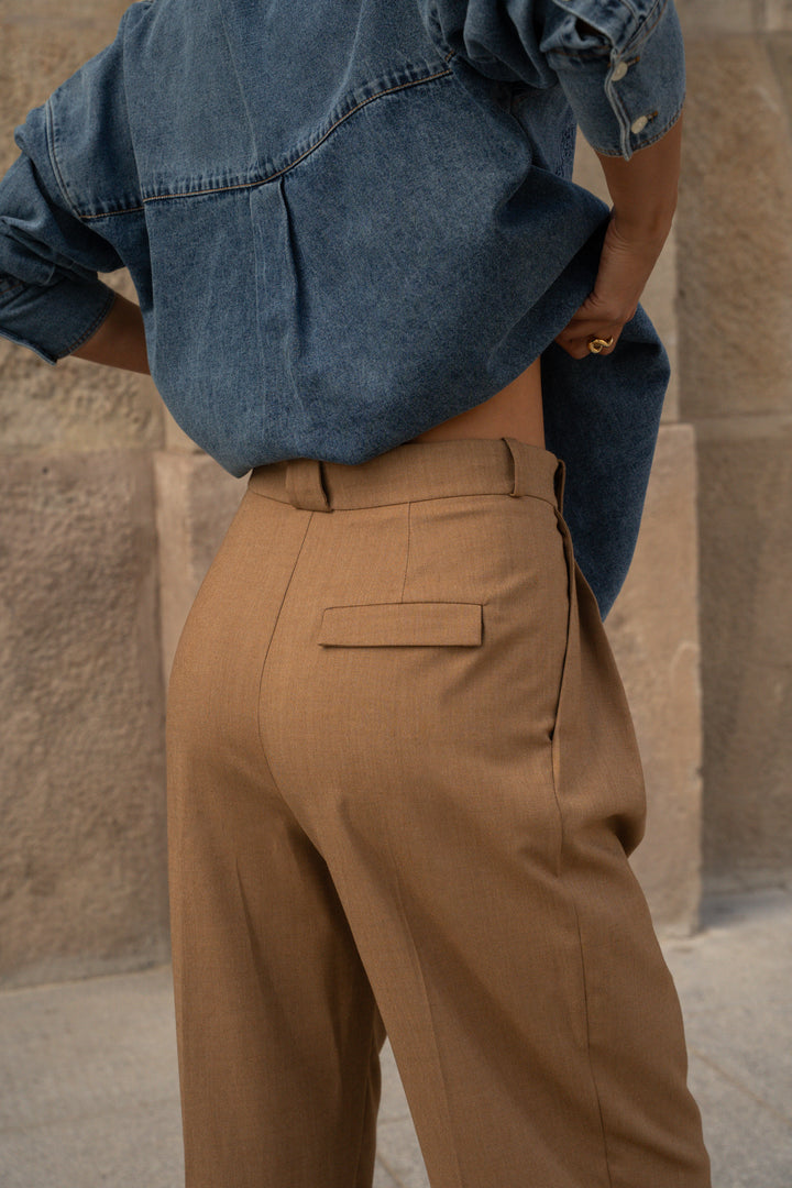 These trousers are the perfect combination of structure and refinement. The delicately designed pleats on the front and covered buttons give them a subtle elegance. Doris features a fitted cut and wide belt loops, two of which are at the front, adorned with buttons, subtly accentuating the waist. At the back, a welt faux pocket completes its balanced and original design.