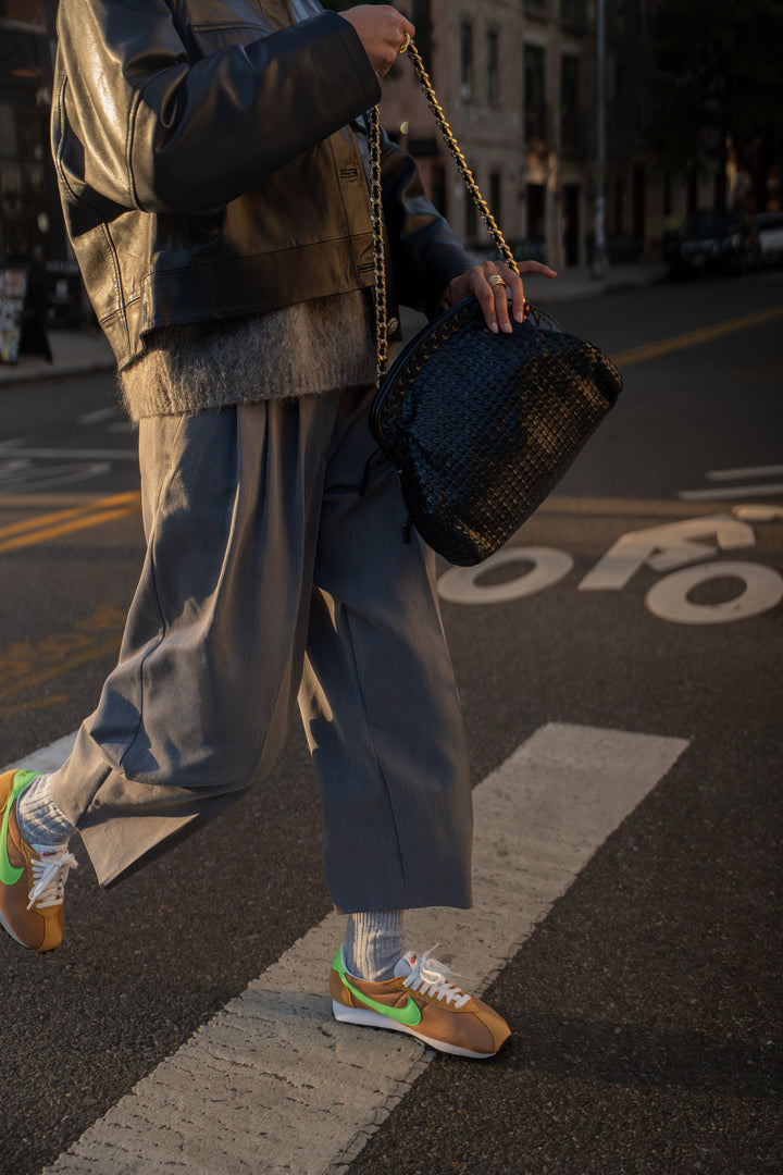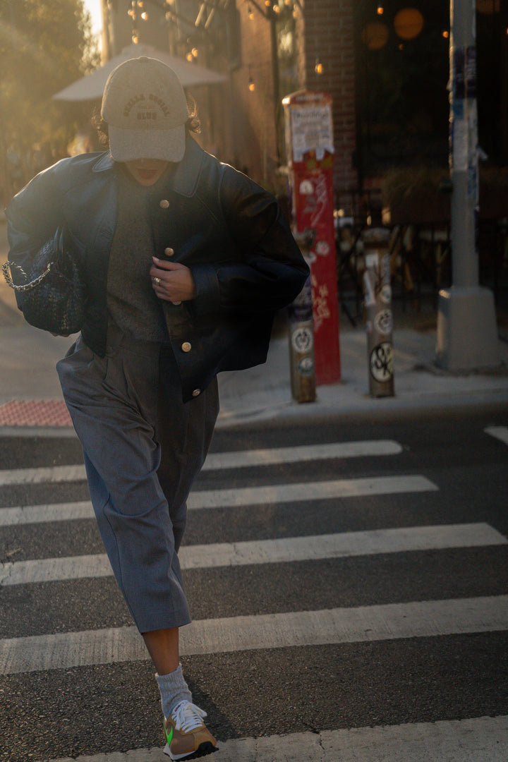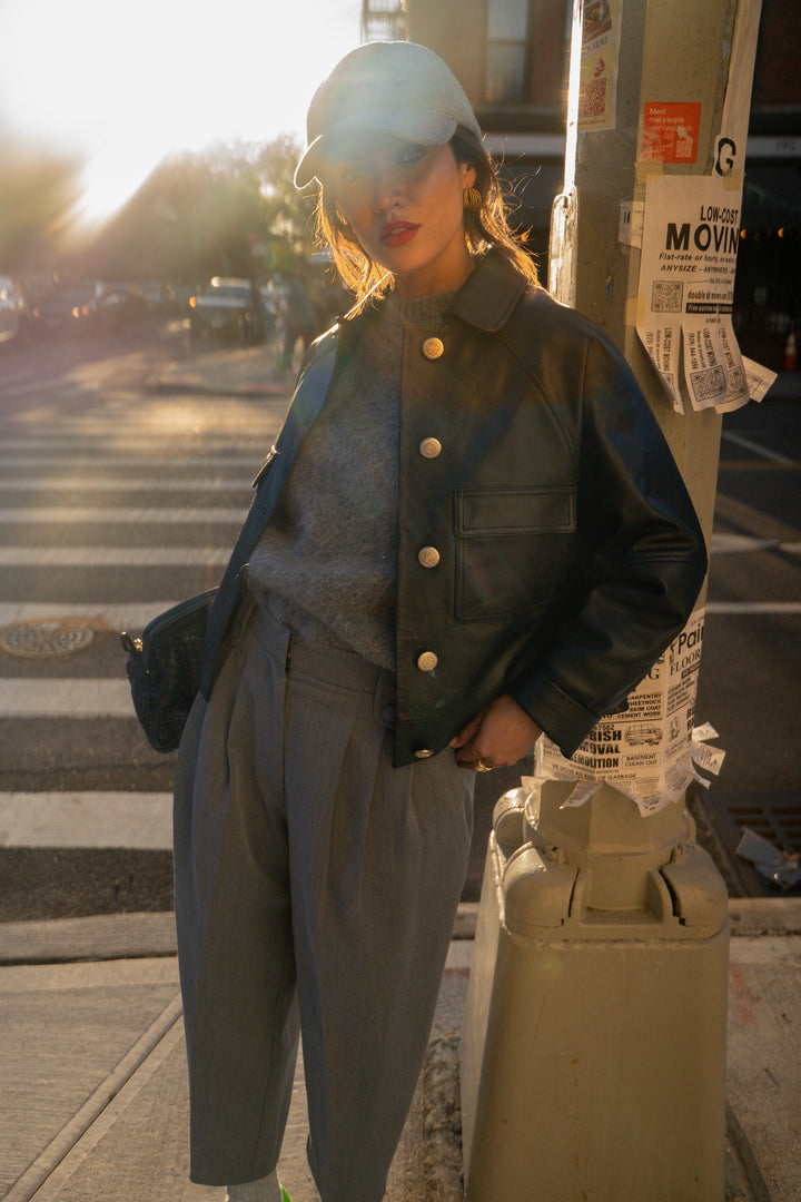 We love it in a monochrome look with a grey sweater and our Dion jacket in black leather to complement the elegance of this outfit.