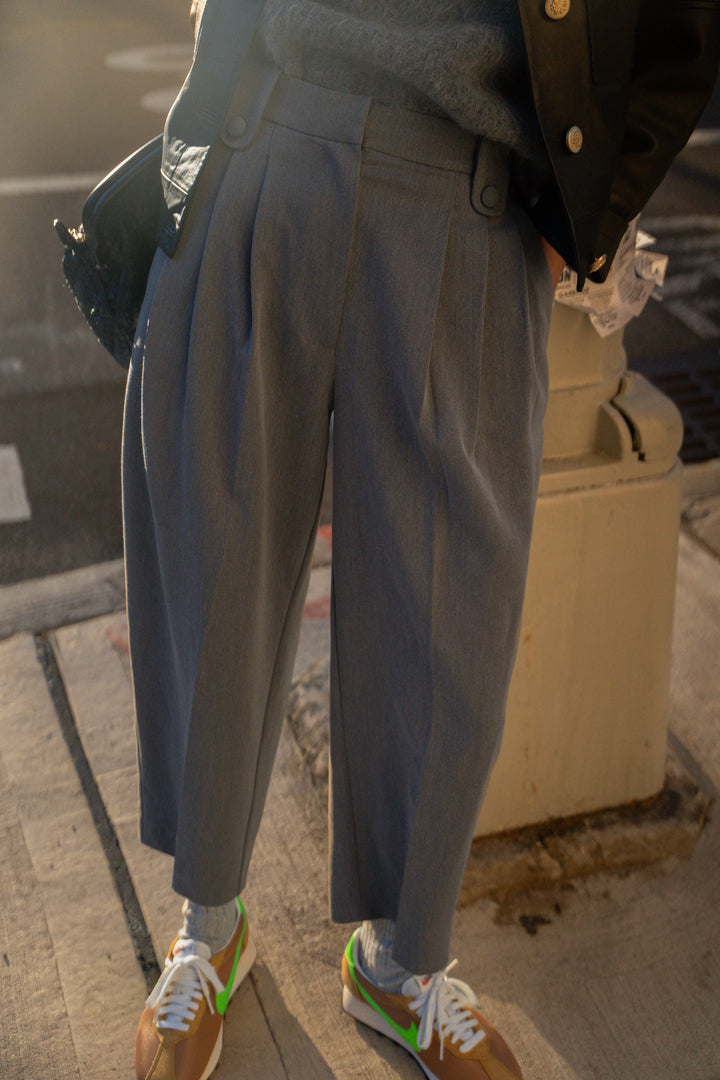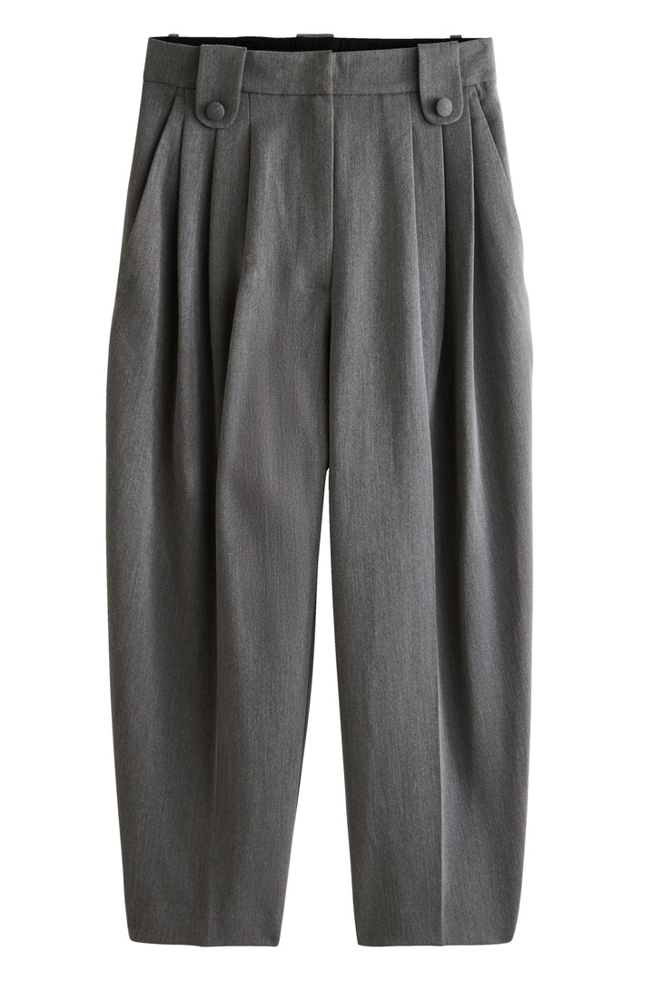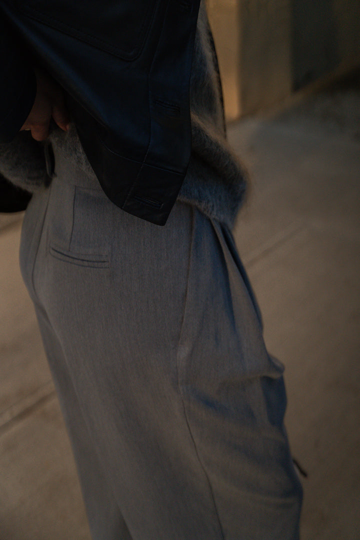 Doris, our dressy tailored trousers with a cropped and loose fit, comes in a metallic grey this season!