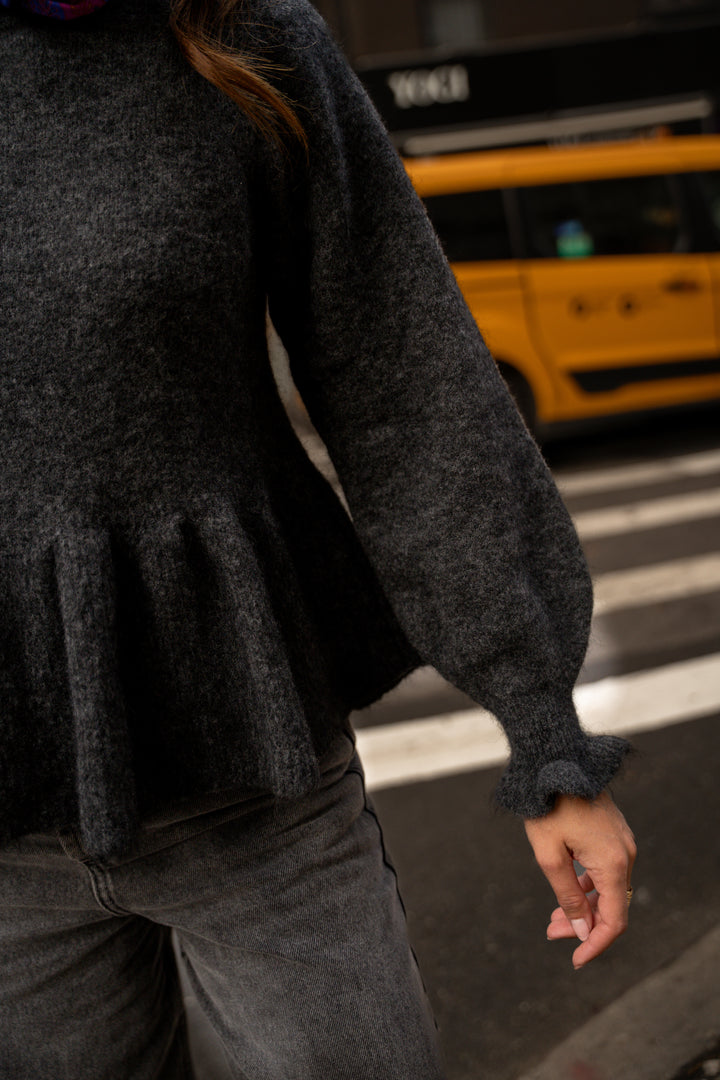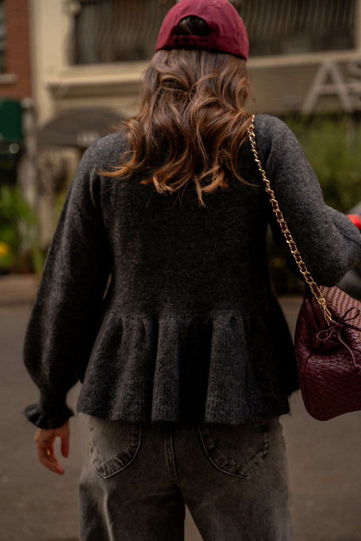Its light and comfortable knit fabric delicately envelops the figure, while its peplum shape emphasizes the waist and adds a pretty movement to the wearer. The puffed sleeves, feminine and structured, end with a small ruffle at the wrist. Its round, understated and timeless neckline makes it an easy-to-wear piece that combines comfort and elegance for everyday wear.