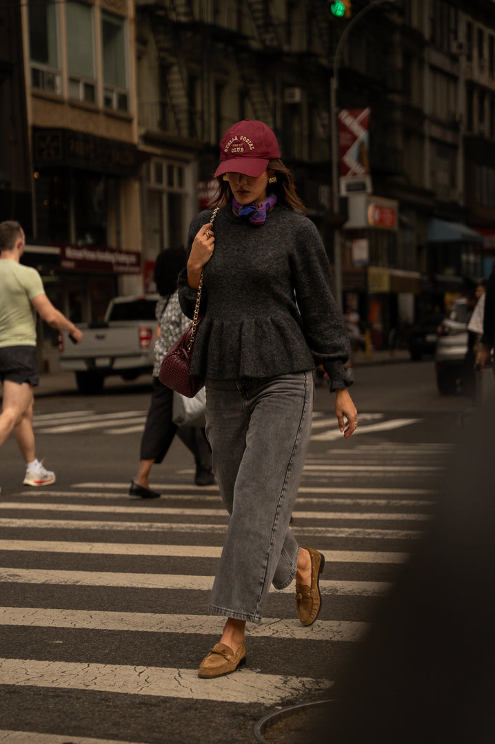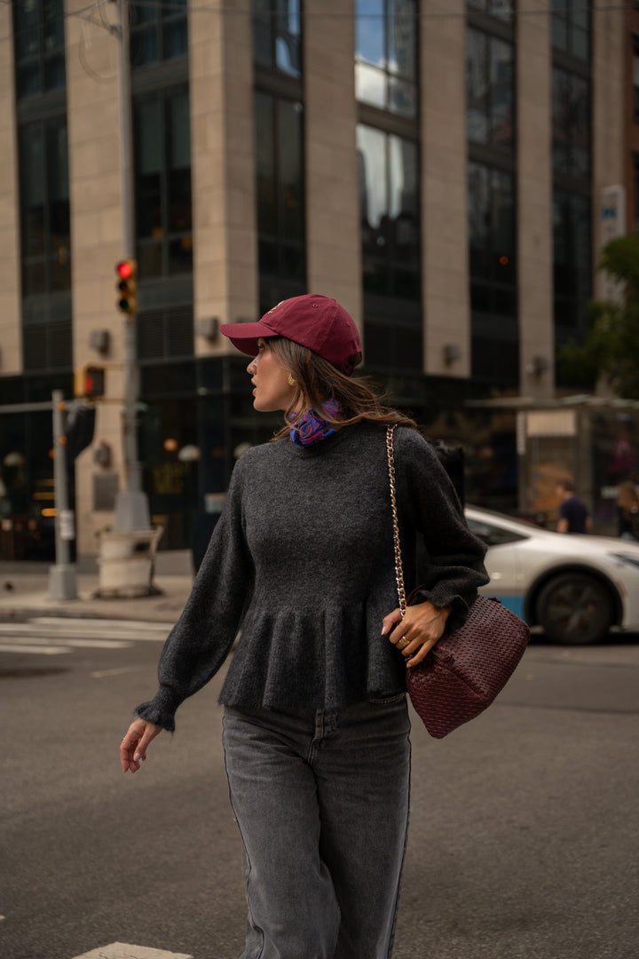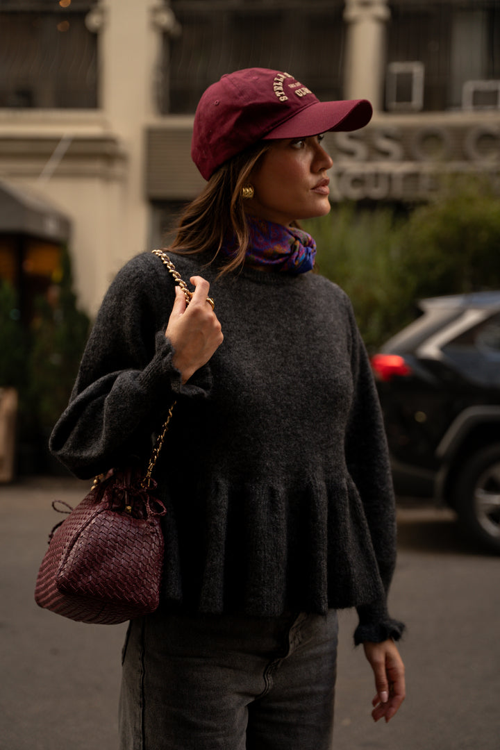 Wear it simply, with our Benji grey jeans and pretty colorful accessories to enhance the look, like the Laurene burgundy cap and our iconic Cellineta bag.