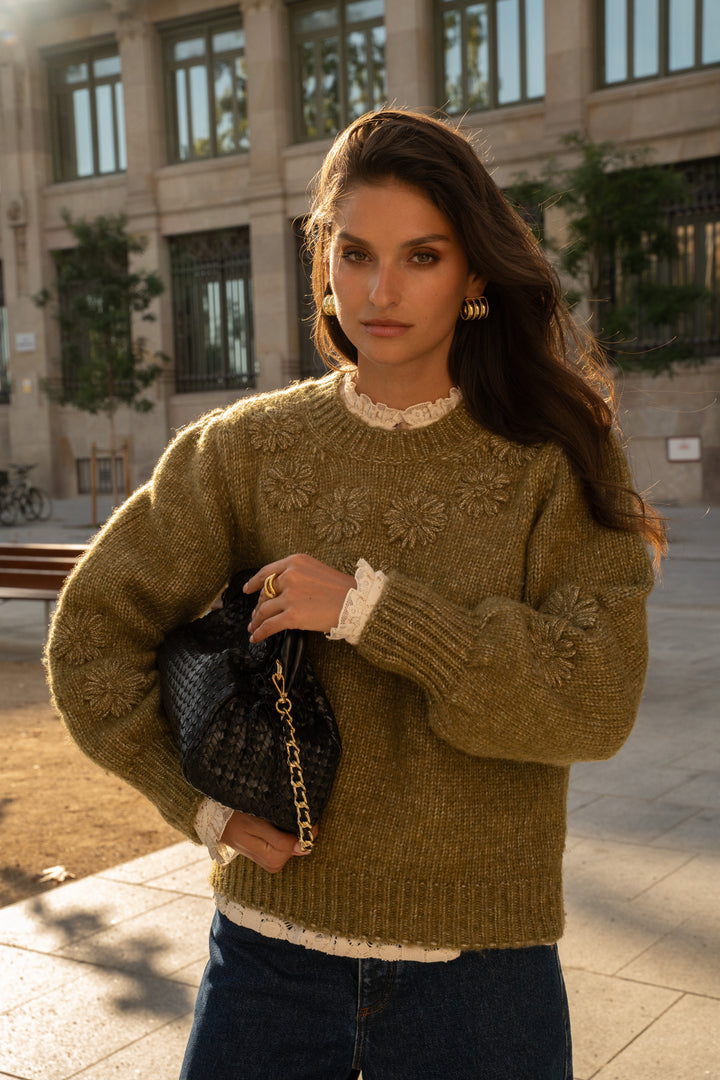 With its fitted cut and round neckline, it offers a modern and casual look. Its slightly puffed sleeves, marked by gathers at the shoulder and tightened at the wrists, create a subtle volume. Fine floral embroidery on the front and sleeves adds an ultimate poetic and feminine touch to this sweater.