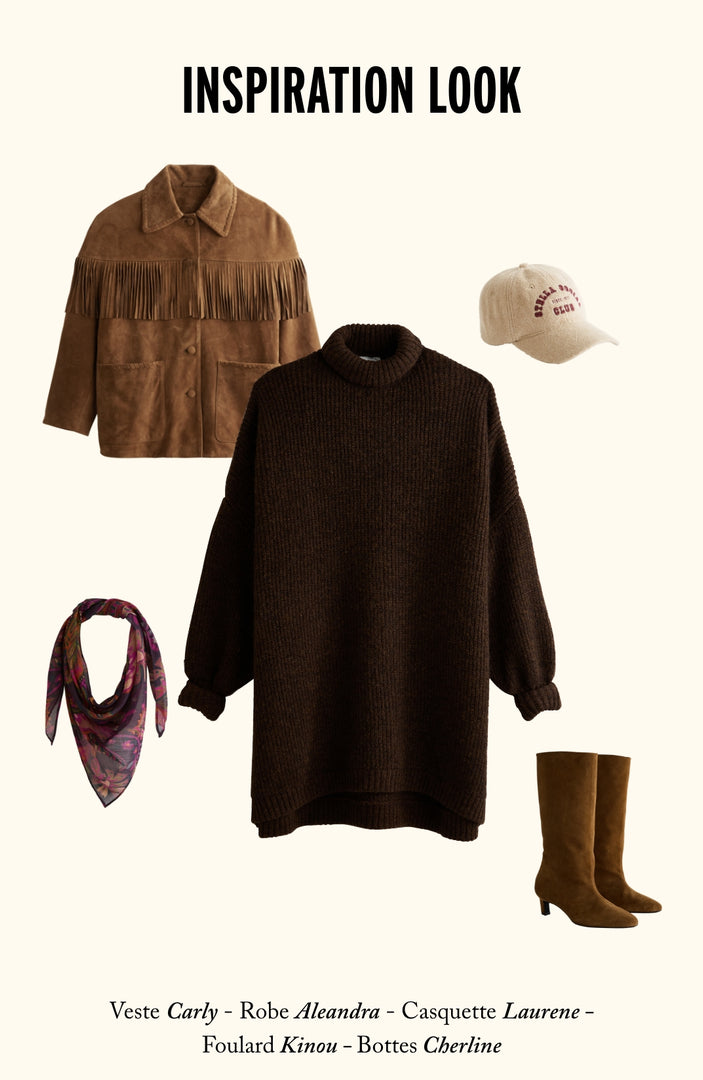 Aleandra is enough on its own: we add our cognac Cherline heeled boots which match perfectly, and the beige Laurene cap for an even more trendy touch.