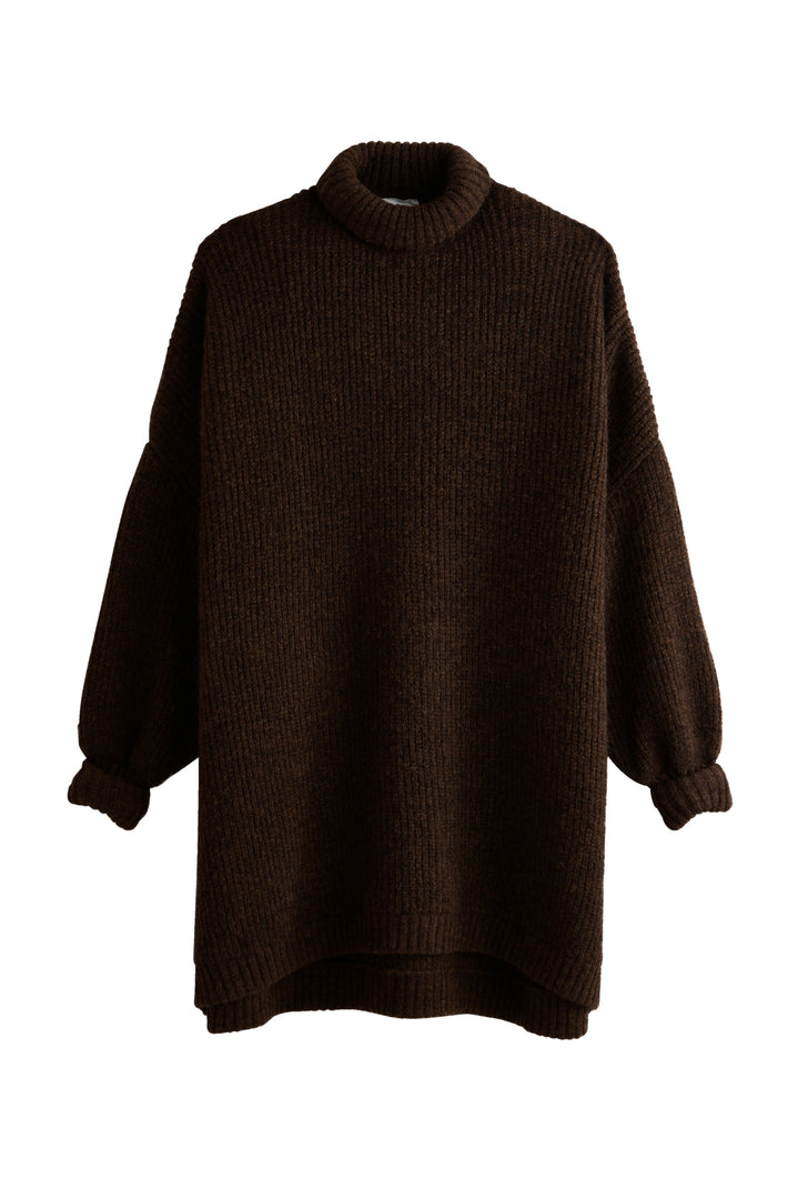 Its loose, flowing cut creates a relaxed yet sophisticated look. Its soft, slightly fuzzy texture, thanks to the wool and mohair blend, envelops the silhouette in comforting warmth, while its deep chocolate hue will be your go-to piece all season long, from morning to night.