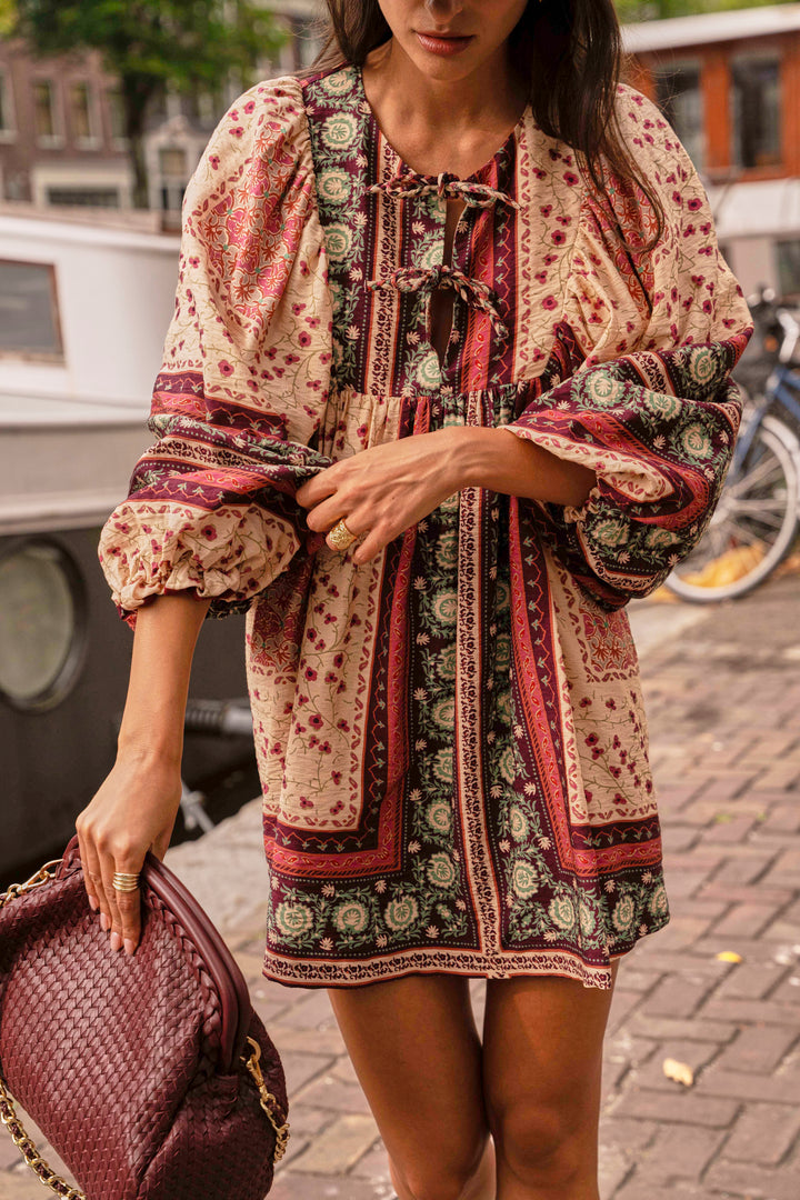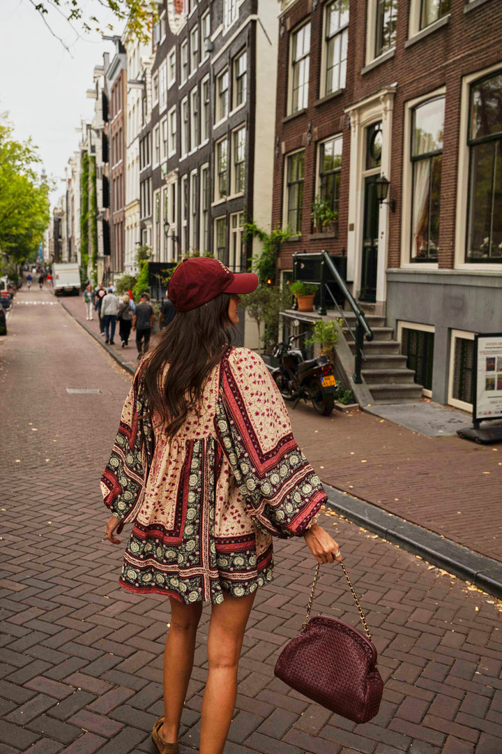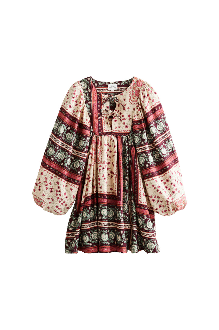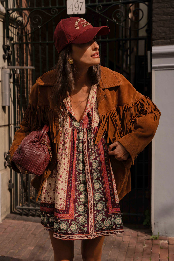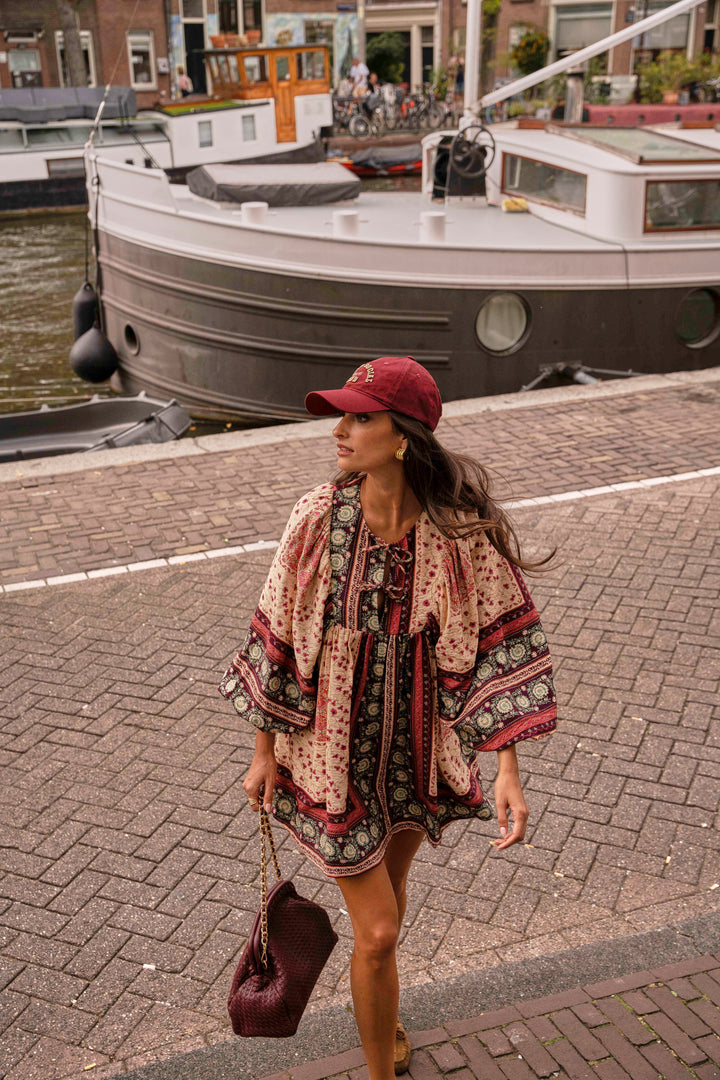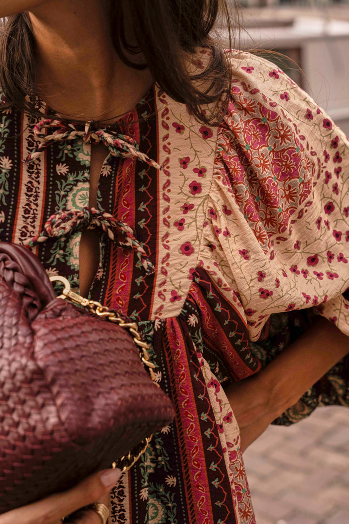 An airy silhouette, delicate details… The Beatriz dress once again captivates us with its "Florina" print, perfect for autumn! A pretty patchwork print with bohemian inspirations in shades of burgundy, pink and celadon, ideal for soft, feminine looks.