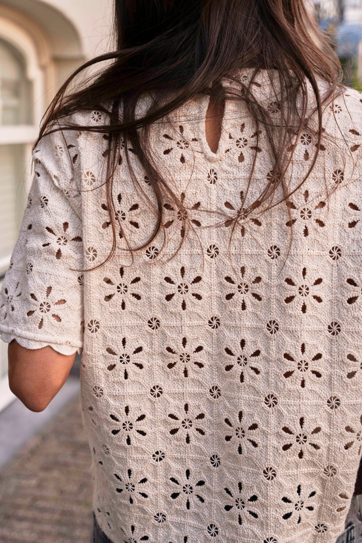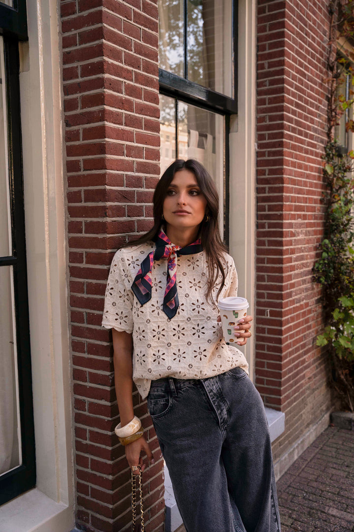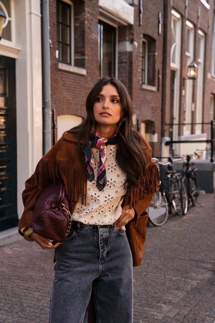 For the back-to-school season, wear it with our Allane grey denim and add the Carly suede jacket, whose cognac color contrasts with this delicate ecru.