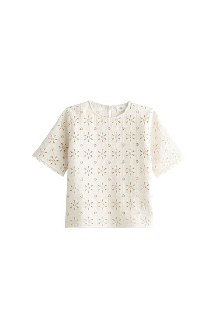 This piece features a boxy cut and a classic round neckline. Its short sleeves, edged with a tone-on-tone piping, add a touch of sophistication.