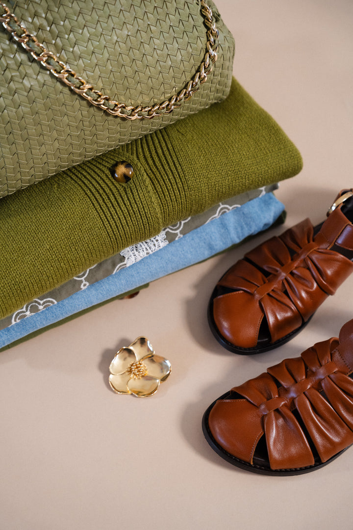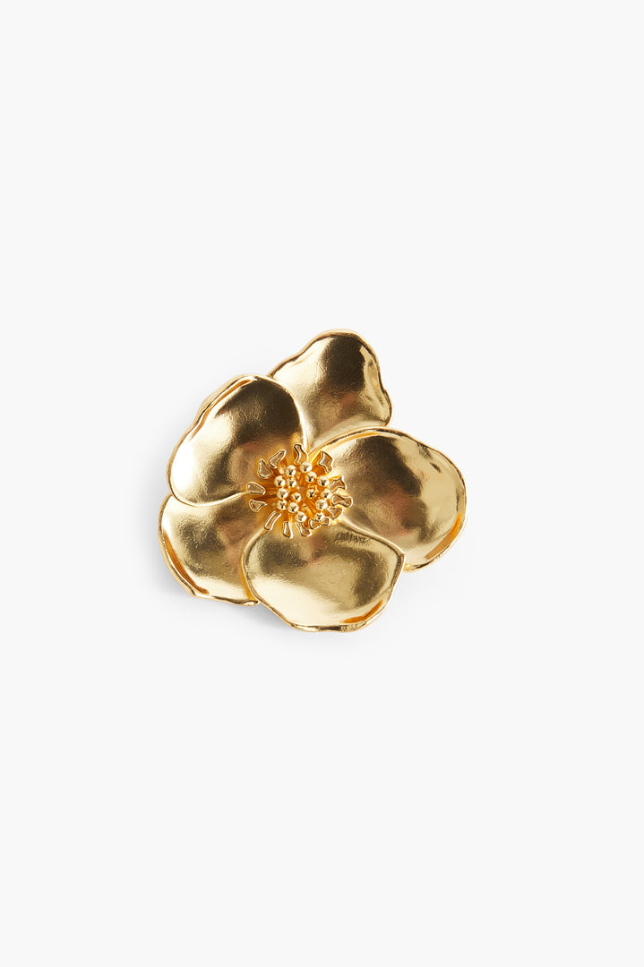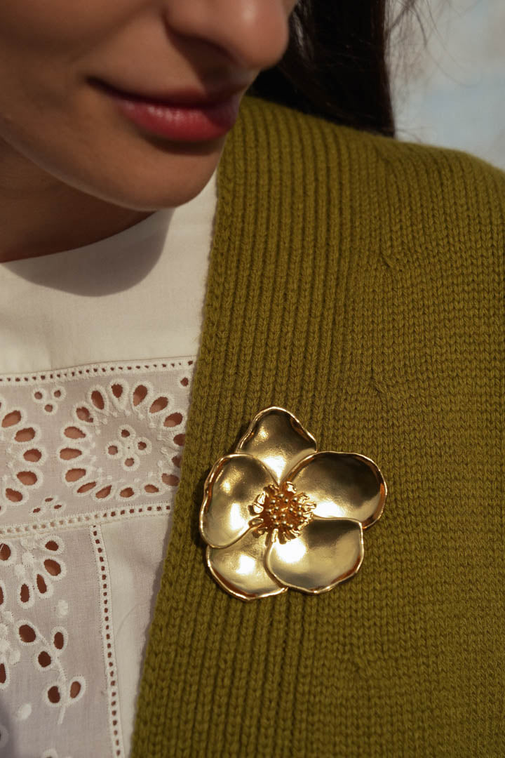Delicate and luminous, this flower-shaped brooch adds a subtle golden touch to the silhouette.