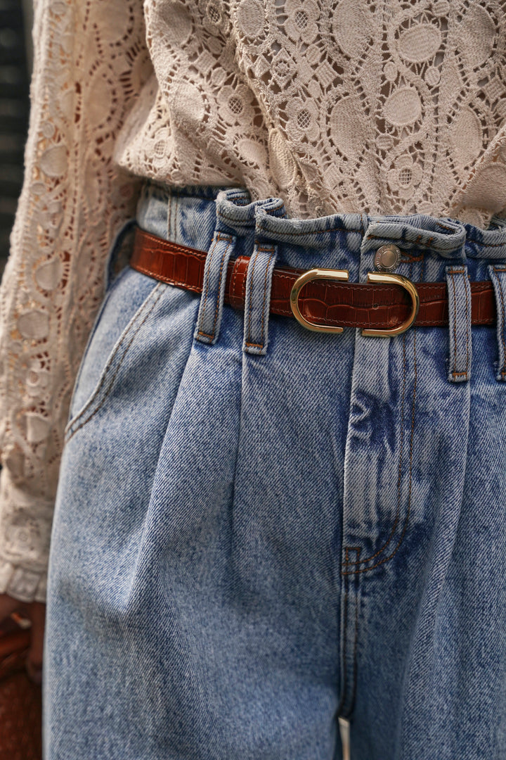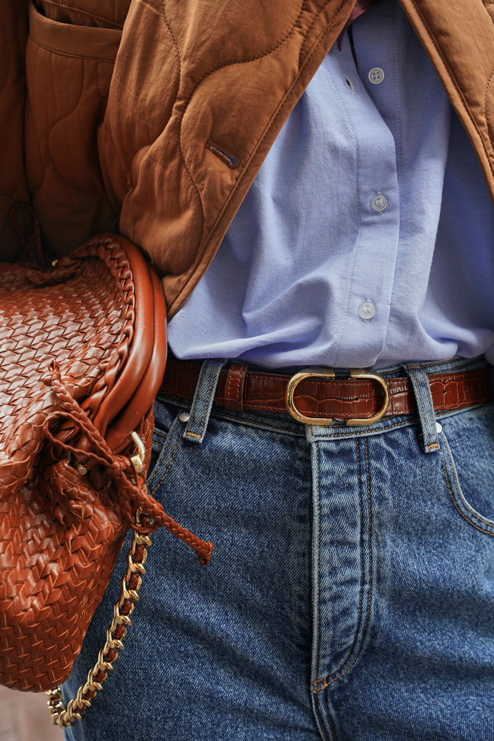 The Hena belt reinvents itself this season, more elegant than ever. Made in a shiny, chocolate-colored embossed leather, it retains its much-loved features: a sleek, gold oval buckle that can be worn in two ways: with the belt over or under the buckle.