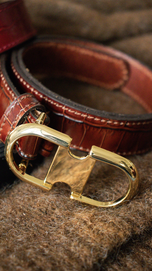 Thin, shiny, embossed leather belt with crocodile effect.