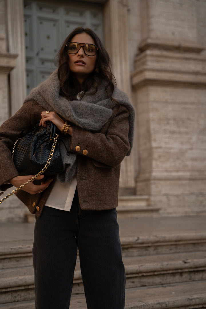 Its timeless cut is enhanced by careful details: a closure adorned with an engraved button, patch pockets on the back and a signature suede jacron that brings a touch of discreet elegance.