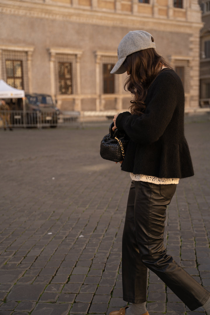 Style-wise, we're wearing it with our favorite black leather Roger bag and pretty pops of color like the heather gray Laurene cap and our Damiano loafers. We're letting the collar of our Loïse blouse peek out to add a touch of elegance.