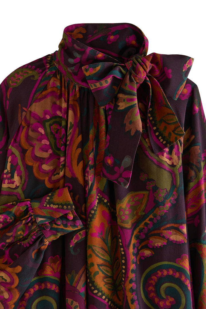 Folk print in pink, khaki, and beige on a sheer violet background.