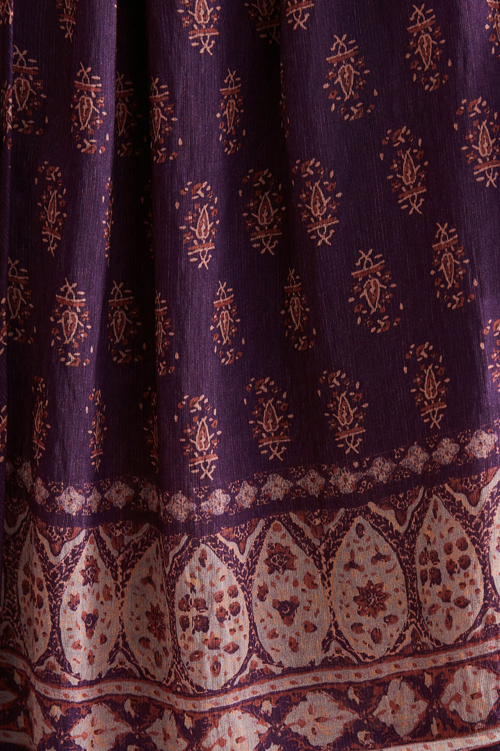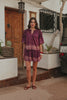 Its print, in deep shades of plum and pink, punctuated with contrasting details at the hem, gives it an irresistible bohemian character. Also noteworthy is its lightweight fabric with a silky finish, which is particularly comfortable to wear.