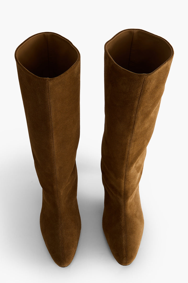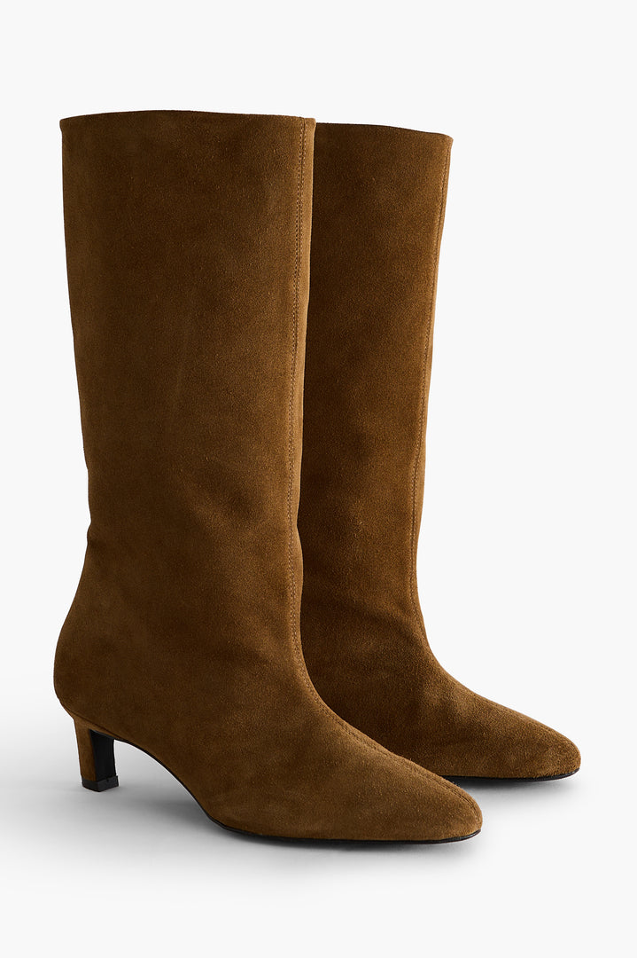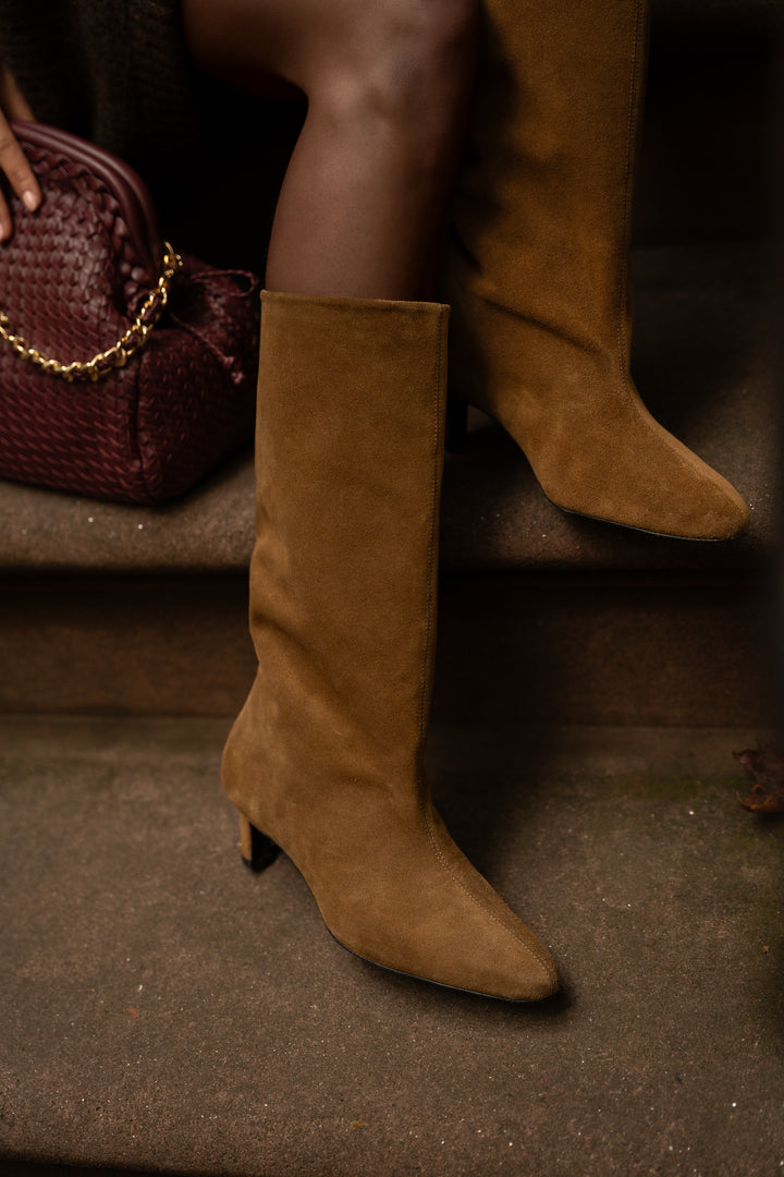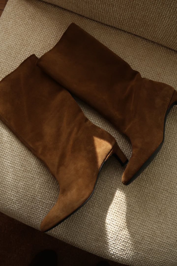 Crafted from soft, velvety suede, they stand out for their clean lines and timeless appeal. Their warm, deep cognac hue blends seamlessly with all autumnal palettes, from raw denim to chocolate knits.